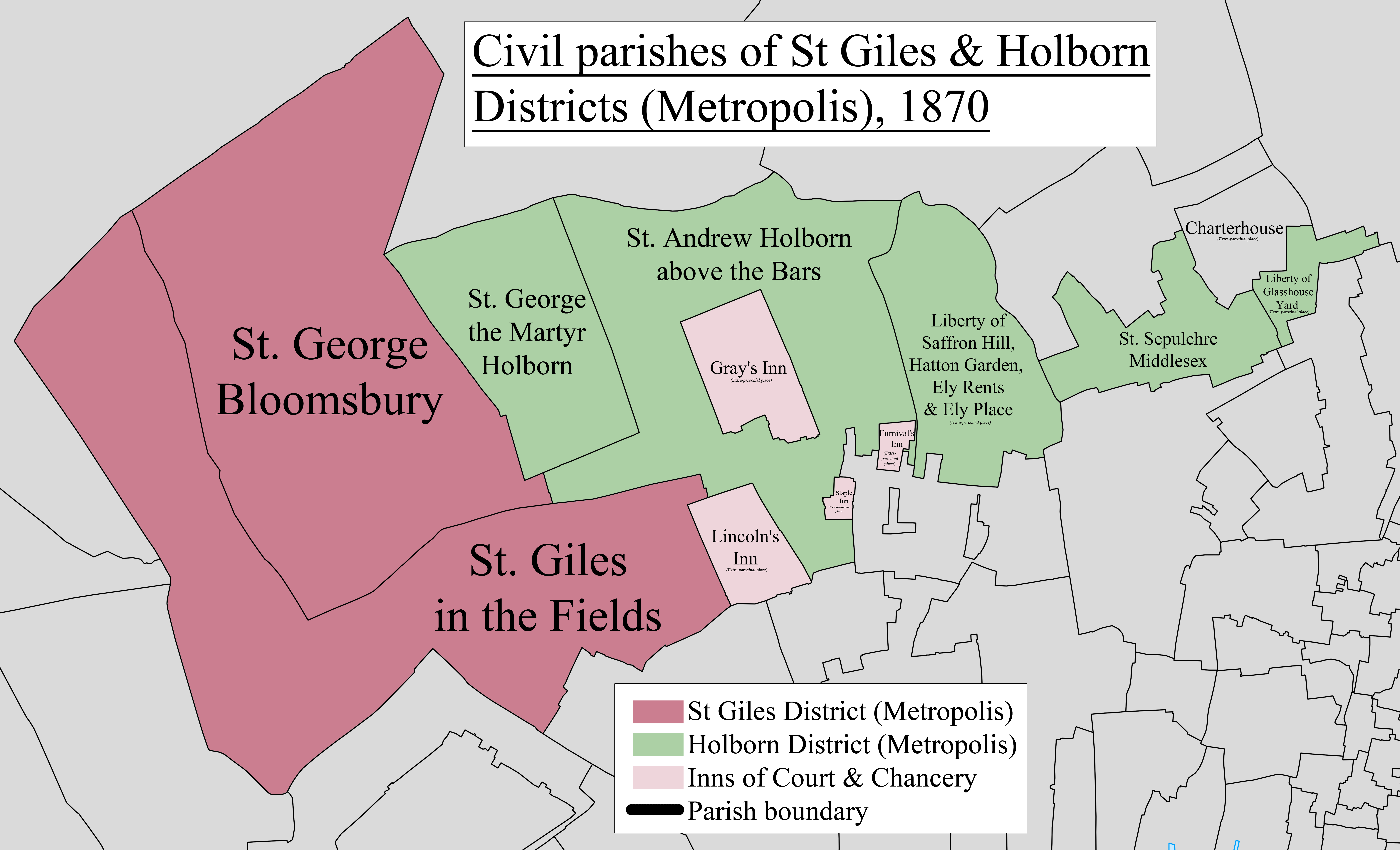 1900년, ''세인트 자일스 구 (수도권)''의 지역은 홀본 구 (수도권)과 합병하여 새로운 홀본 자치구(Metropolitan Borough of Holborn)를 형성했다(홀본에 임시로 부속된 핀스버리 구역의 일부 제외). 새로운 자치구의 구획에 "세인트 자일스"와 "블룸즈버리"의 전통적인 경계가 사용되었지만, 이는 오래된 거리와 도시 이전의 밭 경계의 역사적 기반보다는 현대의 거리 패턴을 반영하기 위해 사소한 합리화 과정을 거쳤다. 결합된 시민 교구는 그 후 상당 기간 동안 병행하여 계속 운영되었다.