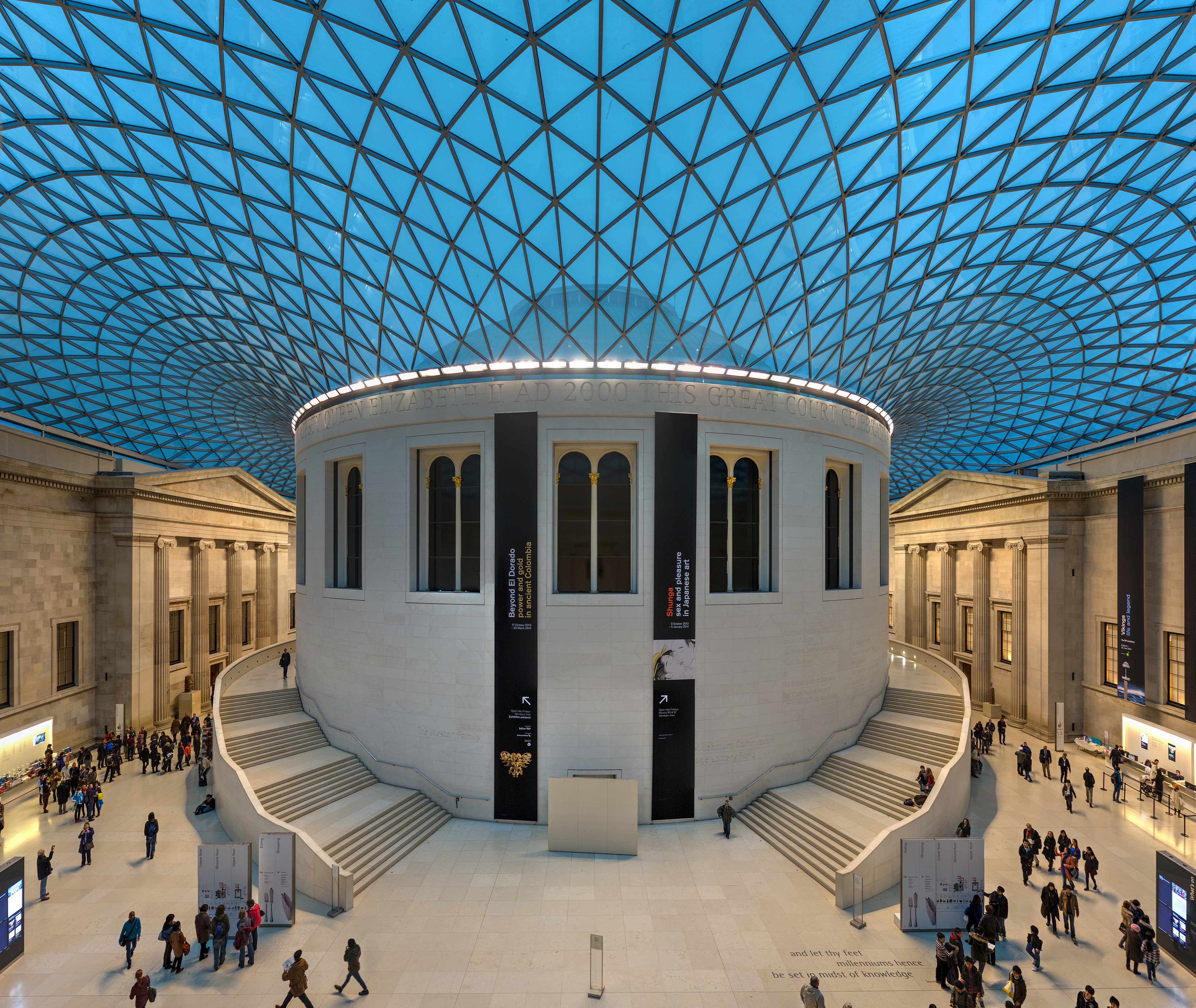 대영 박물관은 1759년 몬태규 하우스에서 처음 일반에 공개되었으며, 블룸즈버리의 중심부에 있다. 박물관 중앙에는 과거 영국 도서관 열람실 주변 공간이 있는데, 이곳은 영국 도서관의 콘크리트 저장 벙커로 채워져 있었으나, 현재는 영국 건축가 노먼 포스터가 설계한 유리 지붕이 있는 실내 광장인 엘리자베스 2세 여왕 대법정이다. 이곳에는 전시관, 영화관, 상점, 카페, 레스토랑이 있다. 1998년부터 대영 도서관은 블룸즈버리 북쪽 외곽, 유스턴 로드에 특별히 지어진 건물에 있다.