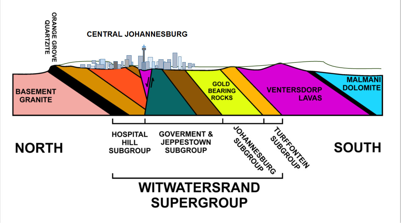 요하네스버그에서 지표면에 도달하는 위트워터스랜드 지층군 지층은 남쪽으로 약 30° 각도로 기울어져 있다.[3] 그곳부터는 매우 드문 예외를 제외하고는 거의 모든 곳에서 더 젊은 암석으로 덮여 있다.[10]