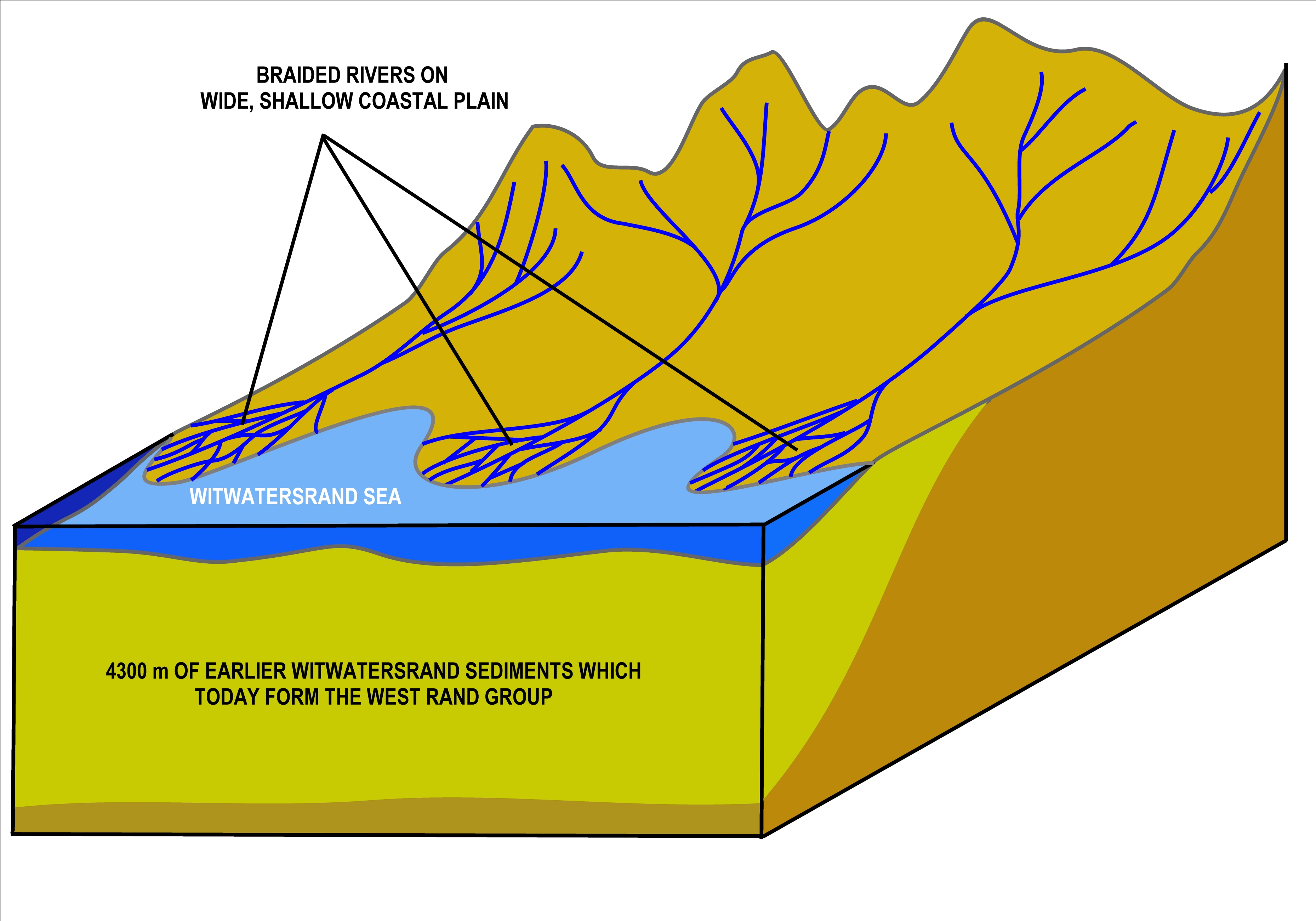 그 이후 비트바테르스란트 산맥을 구성하는 암석은 아래쪽과 남쪽으로 경사져 대부분 지하에 있는 "비트바테르스란트 분지"를 형성하는 것으로 밝혀졌다. 이 분지는 북동쪽의 에반더에서 남서쪽의 테우니센까지 길이 300km의 장축과 남동쪽의 스타인스루스에서 북서쪽의 콜리그니까지 150km의 폭을 가진 타원형 지역을 덮고 있으며,[2] 킨로스에 작은 보조 분지가 있다. 금은 이 분지의 북쪽과 서쪽 가장자리에만 존재하며 연속적인 띠를 이루지는 않는다. 금이 함유된 암석은 북쪽과 서쪽에서 온 고대 하천이 남쪽의 "비트바테르스란트 해"로 흘러들어가기 전에 많은 분류된 수로가 있는 선상지 델타를 형성한 여섯 곳으로 제한된다. 이곳에서는 비트바테르스란트 슈퍼그룹의 더 오래된 암석을 형성하는 이전 퇴적물이 퇴적되었다. 이러한 금을 함유한 선상지 델타 중 일부는 현재 지표면 아래 4km 깊이에 있다.[3][2]