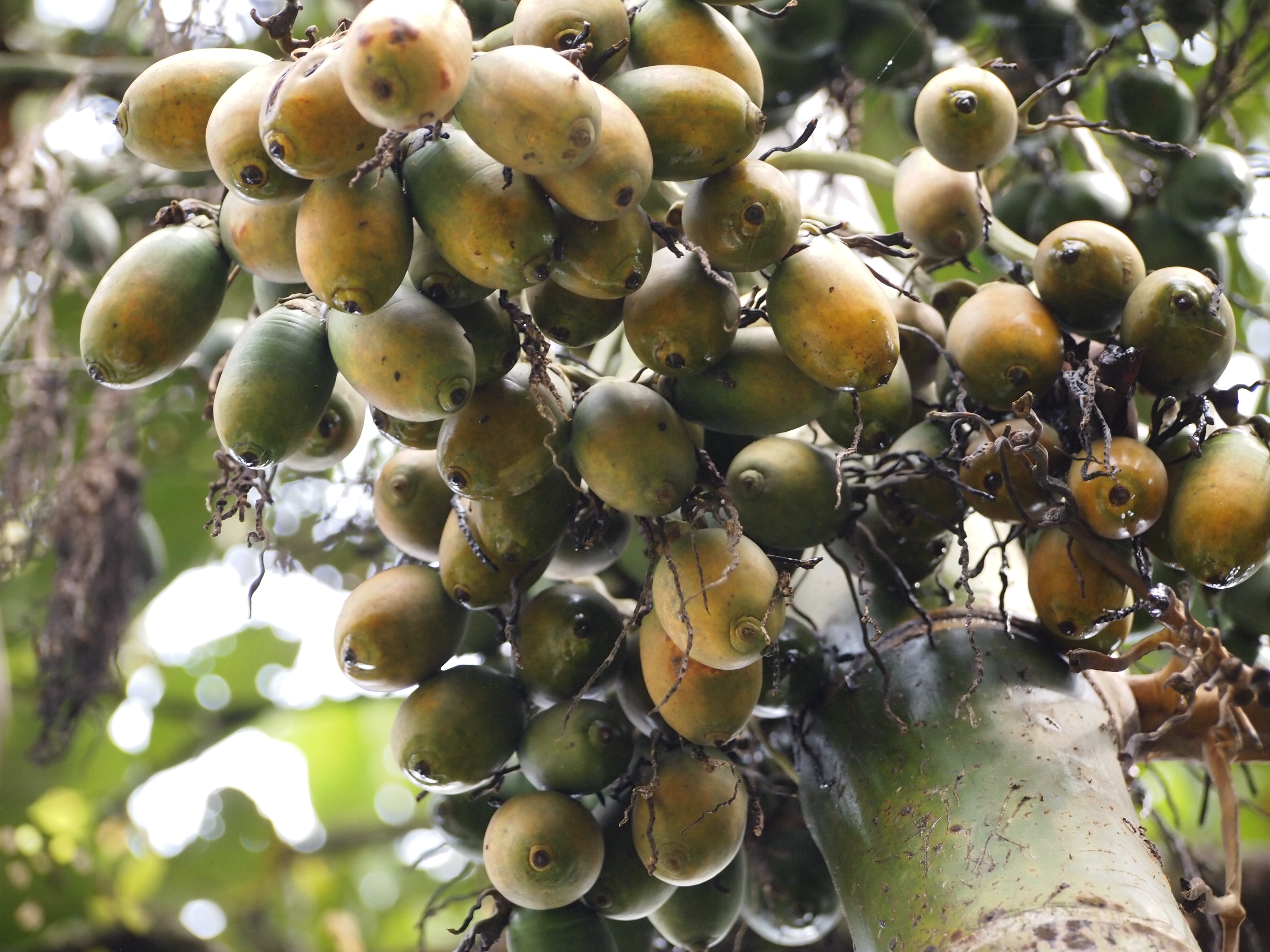 단일 줄기로 높이 10~17m에 달하며, 드물게는 30m에 이르기도 한다. 높이에 비해 가늘고 긴 수형을 가지며, 줄기에는 잎의 흔적인 가로 줄무늬가 있다. 암수한그루이며, 하나의 꽃차례에 암꽃과 수꽃이 각각 핀다. 열매는 장타원형이며, 길이 5cm 전후로 오렌지색에서 짙은 붉은색으로 익는다. 열매는 한 줄기에 대량으로 열리지만, 열매 1개 안에는 대리석 무늬의 씨앗이 1개 들어있다.[1]