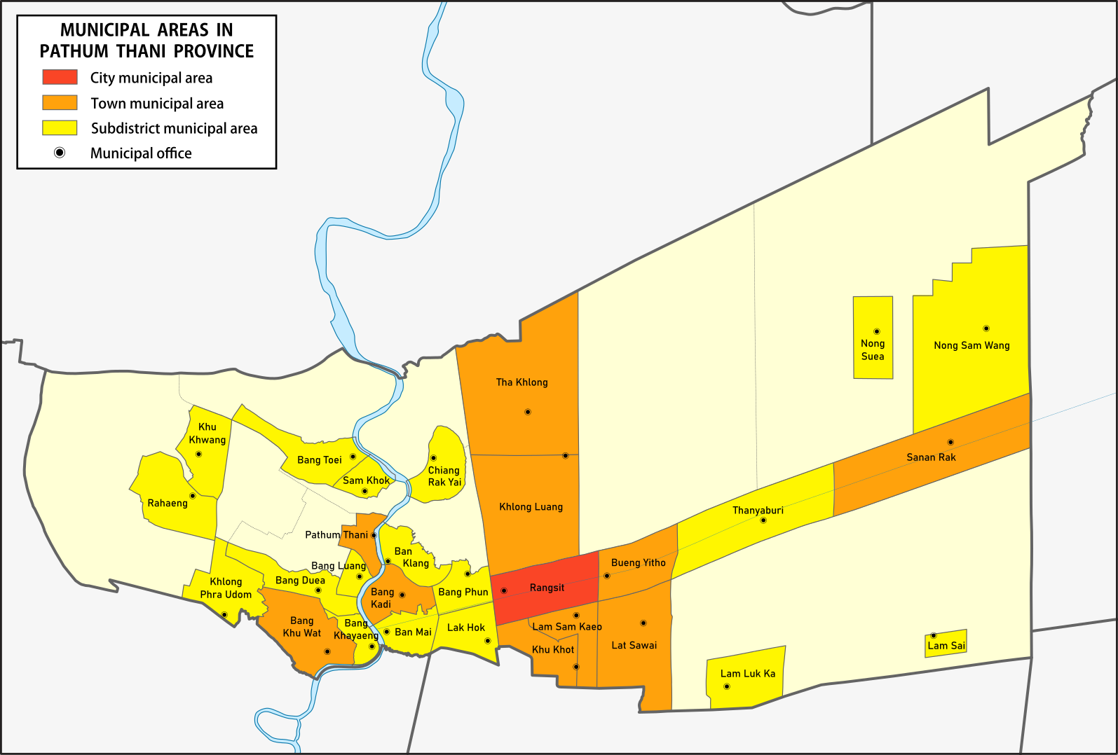 2020년 9월 29일 기준으로 빠툼타니 주에는 빠툼타니 주 행정 기구(PAO, ) 1개와 시(''thesaban'') 29개가 있다. 랑싯은 시(''테사반 나콘'') 지위를, 10곳은 읍(''테사반 므앙'') 지위를, 18곳은 면(''테사반 탐본'') 지위를 갖는다.| 시 | 인구 |