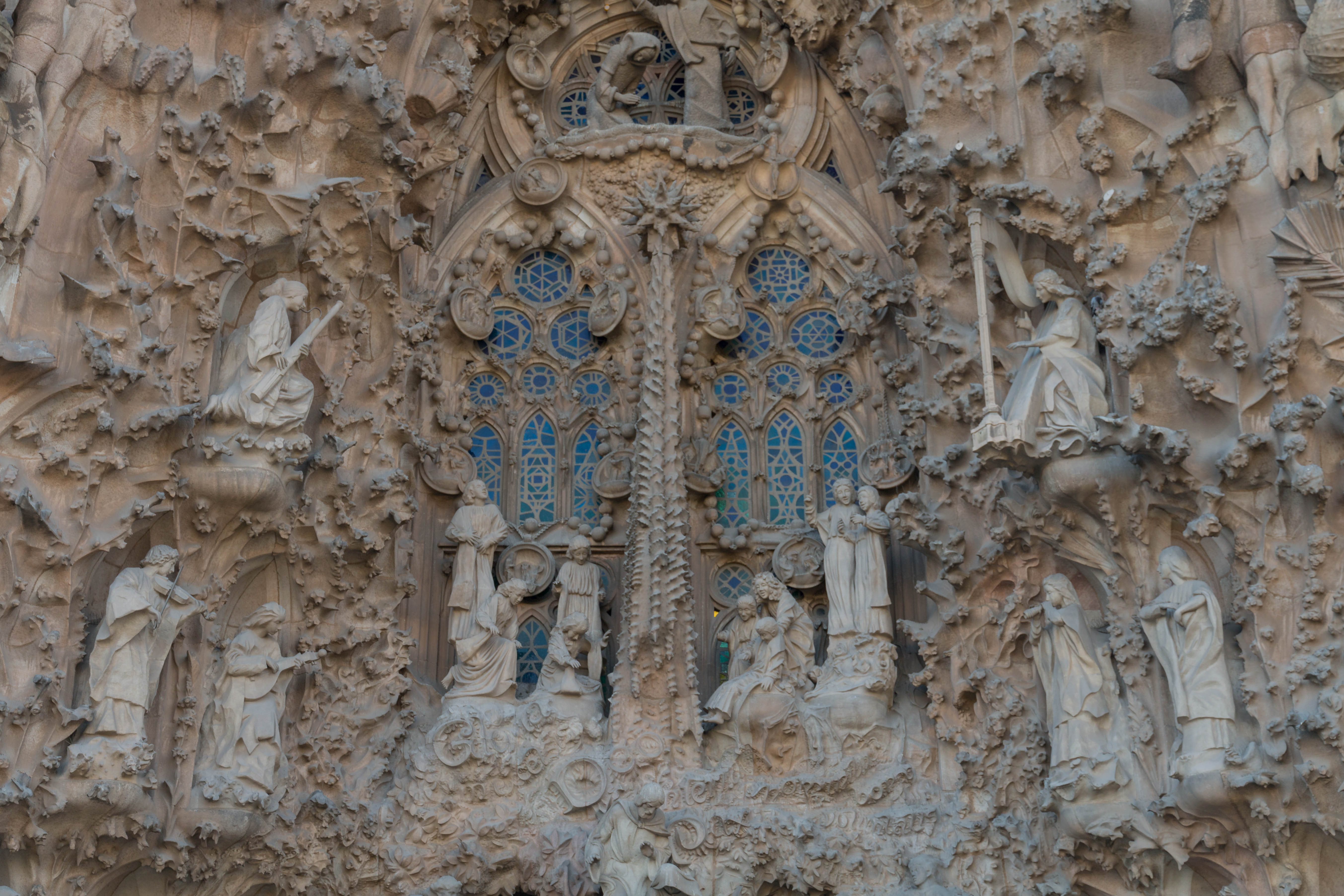 사그라다 파밀리아는 카탈루냐 모더니즘 건축의 상징이자 안토니 가우디의 미완성 역작이다. 바르셀로나의 대표적인 건축물로, 독특한 디자인과 상징성으로 유명하며 스페인에서 가장 많은 관광객이 찾는 명소 중 하나이다.[83][84] 가우디 생전에 완성된 지하 성당과 탄생의 파사드 등은 2005년 "안토니 가우디의 작품군"의 일부로 유네스코 세계문화유산에 등재되었다. 속죄 교회로 시작되어 초기에는 기부금으로 건설 자금을 조달했으나, 1990년대 이후 관광 수입 증가로 재정 상황이 개선되었다.