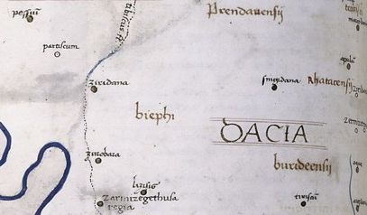 'SARMIS.E[T].GETUSA REGIA' | 사르마티아와 게타에/게트족의 수도/왕궁 (다키아인과 게타에족은 상호 교환 가능한 용어, GETUS 뒤의 -A는 소유격을 나타내는 라틴어) |