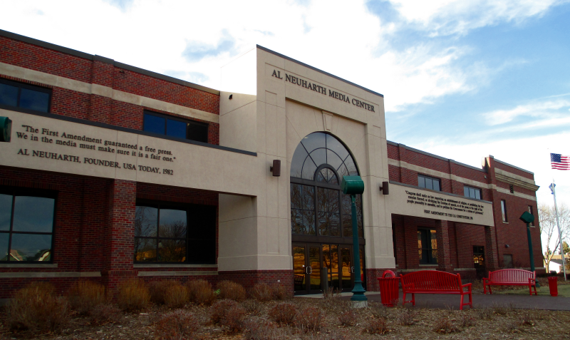 2003년 9월, USA투데이(USA Today) 창립자인 동문 알 노이하르트(Al Neuharth)의 이름을 딴 알 노이하르트 미디어 센터가 500만달러의 비용을 들인 개보수 공사 끝에 개관했다.[50] 이 센터에는 프리덤 포럼(Freedom Forum)의 사우스다코타 운영 부서, 사우스다코타 공영방송(South Dakota Public Broadcasting), 현대 미디어 및 저널리즘 학과, 캠퍼스 신문 ''더 볼란테(The Volante)'', 캠퍼스 라디오 방송국 KAOR, TV 방송국 KYOT가 있다. 이 건물은 원래 무기고와 체육관이었으나, 1950년 USD 졸업생인 알 노이하르트의 기부금으로 미디어 센터로 개조되었다.[14]