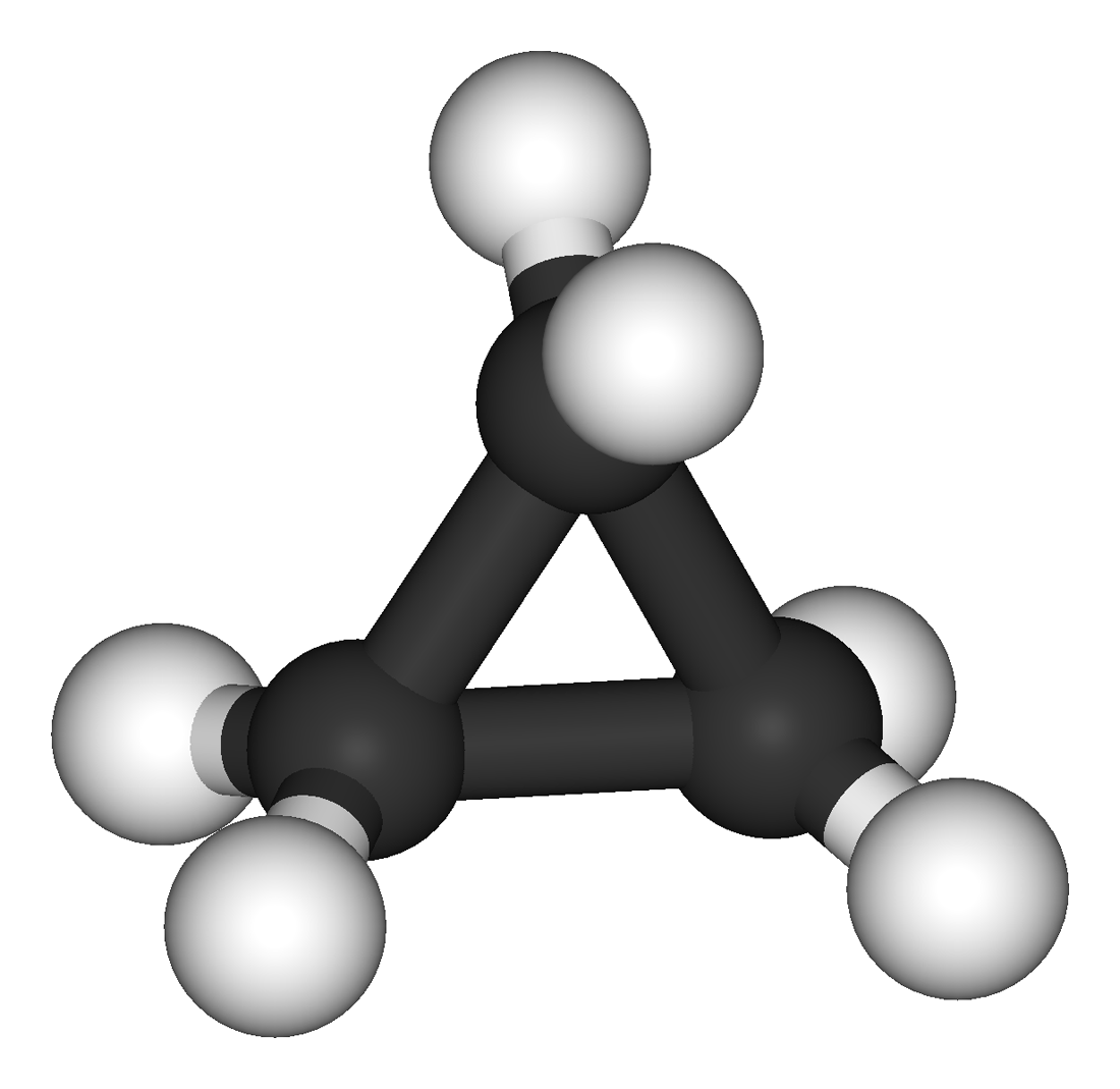 사이클로프로페인은 삼각형 구조로, 탄소-탄소 결합 각이 60°이다. 이는 sp3 혼성 오비탈의 이상적인 각도인 109.5°보다 작아 큰 고리 변형을 유발한다. 또한 수소 원자들이 가려진 입체 배열을 하고 있어 비틀림 변형도 나타난다.[37] 이러한 이유로 사이클로프로페인은 일반적인 알케인보다 불안정하고 반응성이 크다.