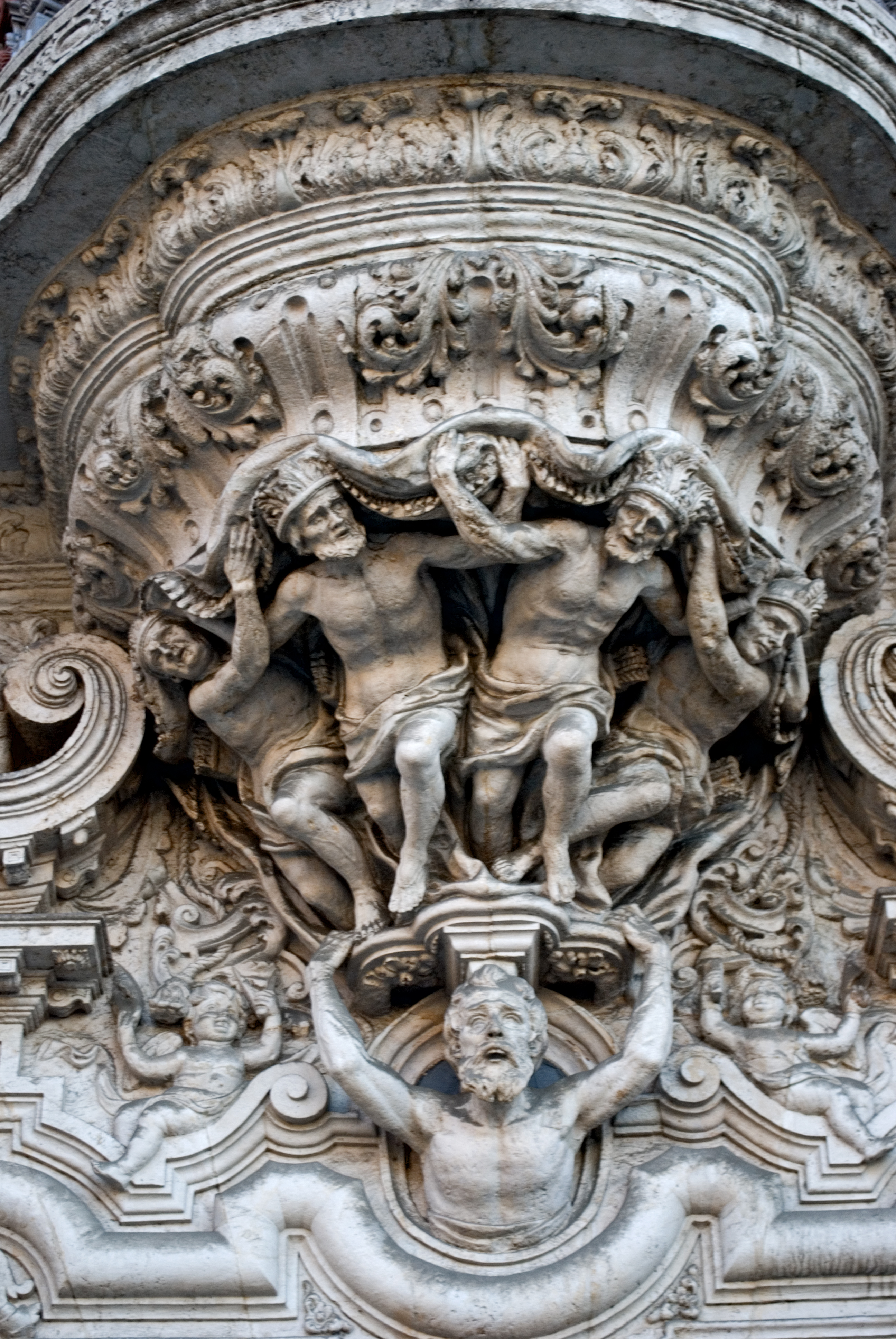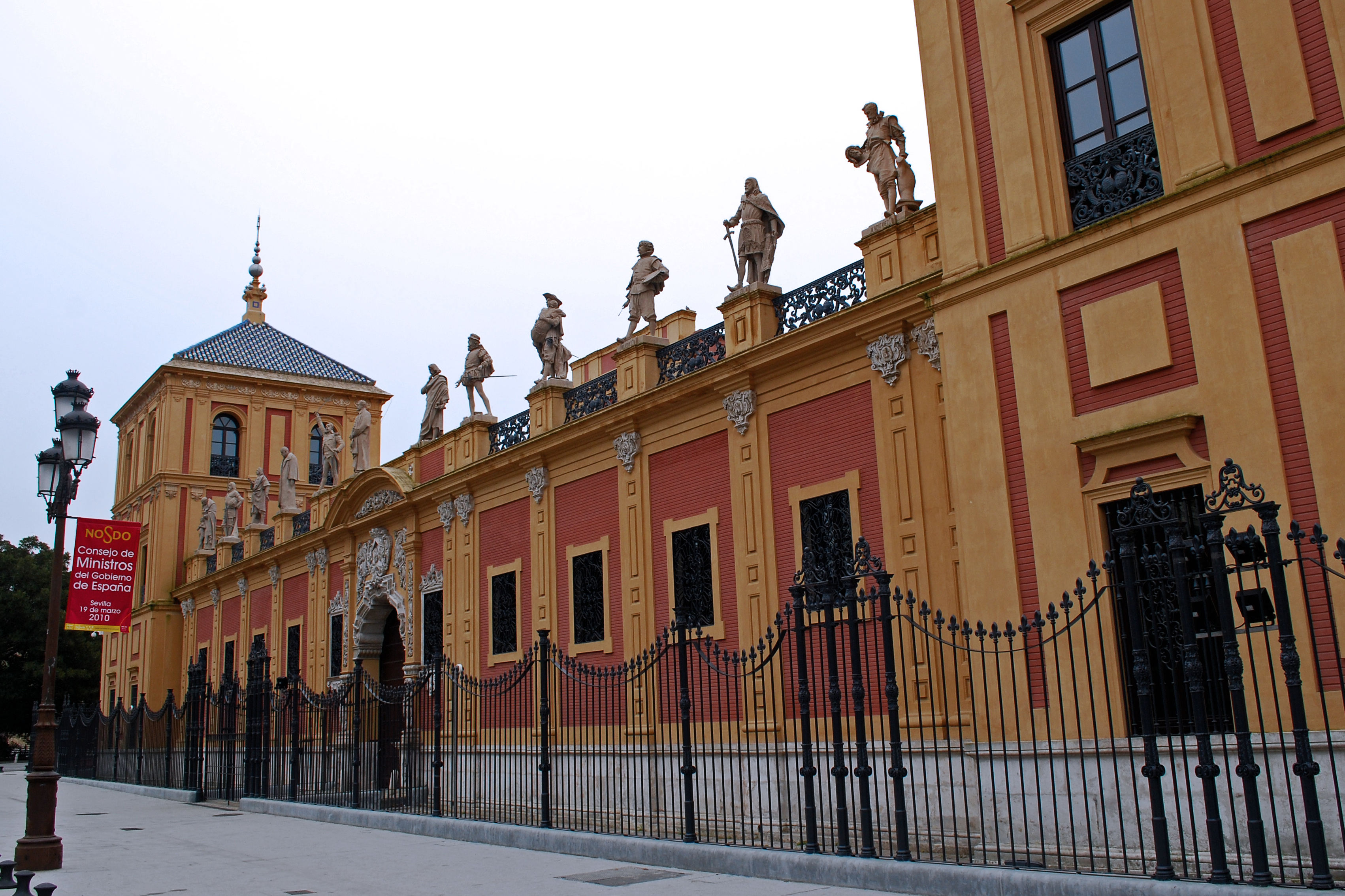 이 궁전은 세비야 바로크 건축의 상징적인 건물 중 하나이다. 정면은 1754년에 완성된 웅장한 추리게라 양식 입구로 구별되며, 이는 레오나르도 데 피게로아의 아들인 마티아스와 손자인 안토니오 마티아스의 작품으로, 50,000 페소의 비용이 들었다.[2] 입구는 여러 부분으로 구성되어 있다. 문 양쪽에는 각각 3개의 기둥이 있다. 문 위에는 아틀란테스(사람의 형태를 한 조각상 지지대)가 받치고 있는 발코니가 있다. 12개의 우화적인 여성상은 항해 예술과 과학을 나타낸다. 마지막으로 기둥과 페드로 곤잘레스, 선원의 수호 성인인 산 텔모(또는 엘모)의 모습이 있는 조각 그룹이 있으며, 도시의 수호 성인인 성 페르디난드(카스티야의 페르난도 3세)와 성 헤르메네길드가 그 옆에 있다.Hotel Alfonso XIII 건너편의 Calle Palos de la Frontera를 마주보는 파사드 꼭대기에는 1895년 안토니오 수실로가 조각한 12명의 유명한 세비야인 조각상이 있다.[2] 12개의 인물은 다음과 같다.