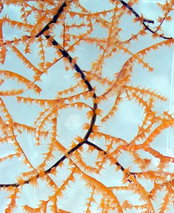 | 흑산호목 (Antipatharia) | 검은색의 골격을 가지며, 심해에 서식한다. 가늘고 긴 가지를 가진 덤불 모양의 군집을 이루며, 어두운 색의 가시가 있는 가지 축 골격은 독특하고 비콜라겐 단백질로 강화된다.[2] | ![]() | |