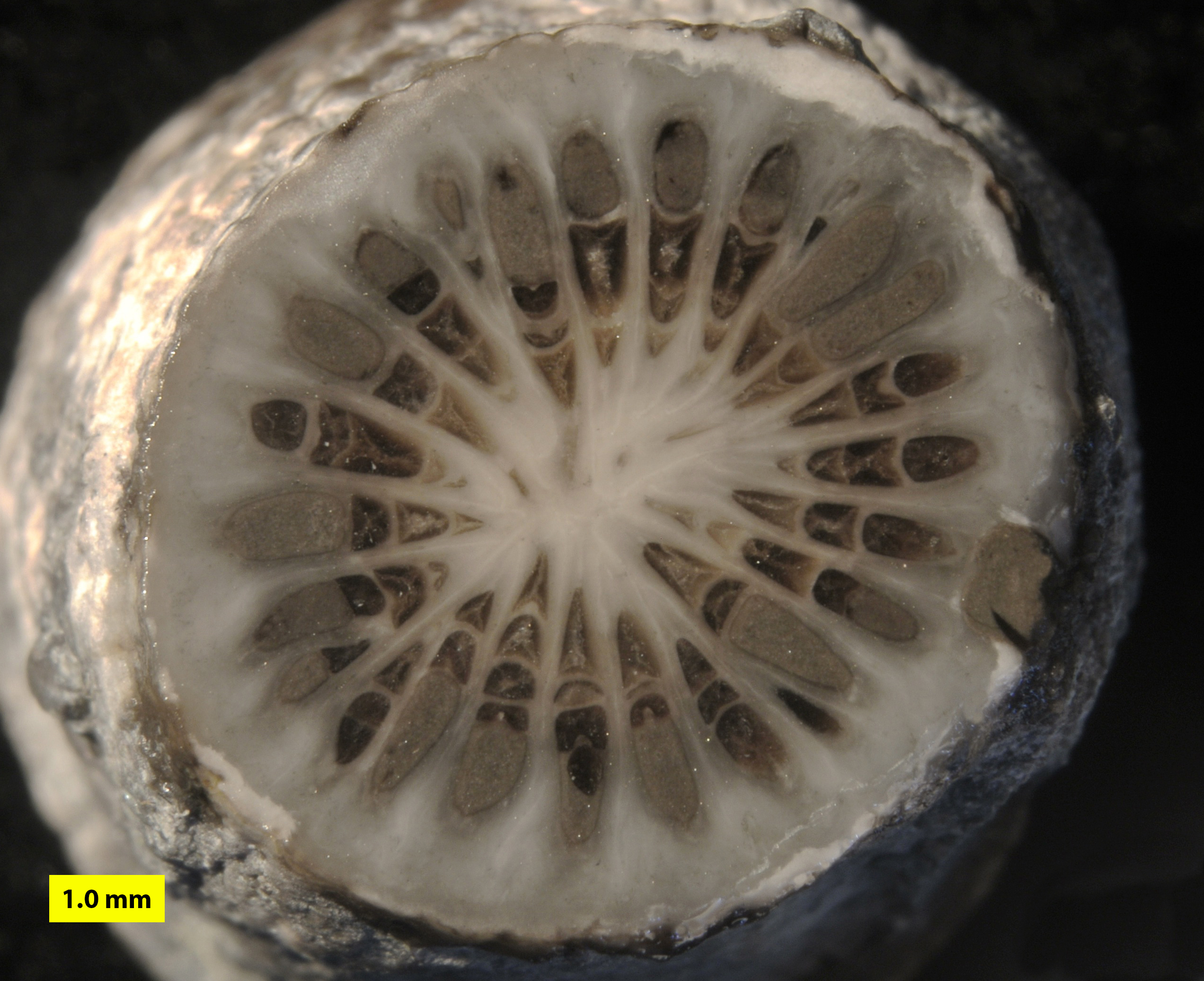 | 육방산호강 | 주름산호목 멸종 | ![]() | Stereolasma rectum | 중기 오르도비스기부터 후기 페름기까지 풍부했던 멸종된 목. 단독 또는 군집, 석회암으로 형성된 골격. 격막은 4의 배수로 발달한다.[8] | 광범위하게 분포한다. |