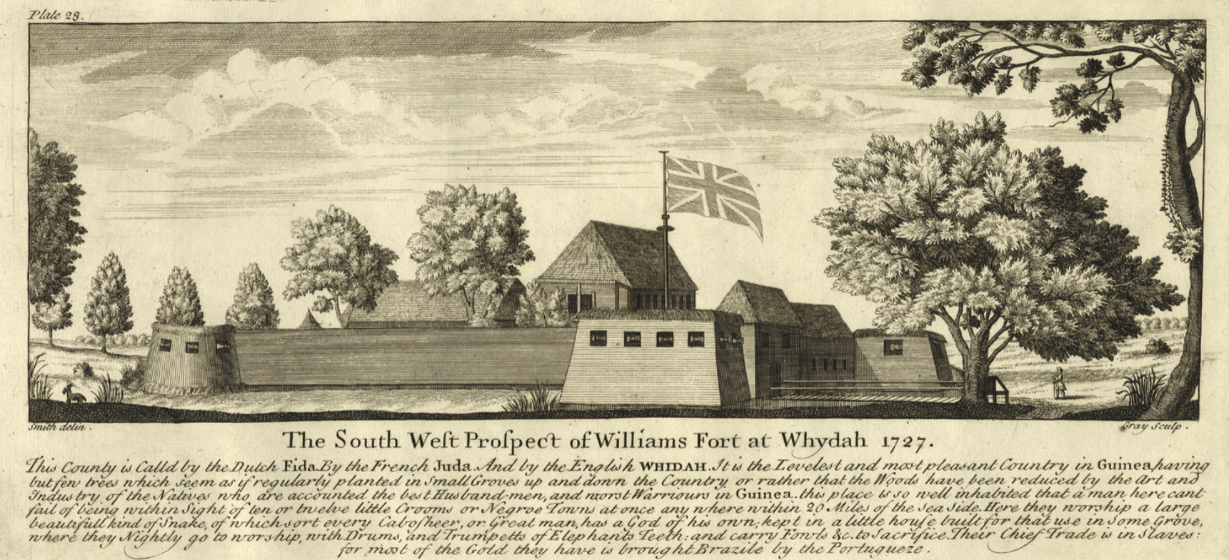 대항해 시대 말기인 17세기, 포르투갈은 기니 만 일대에 10여 곳의 요새와 상관을 건설하여 현지 무역을 독점하고, 기독교(가톨릭교회) 포교 활동을 펼쳤다. 상 조앙 바프티스타 데 아유다 요새도 그 중 하나로, 당시 주요 수입원은 노예 무역이었다. 브라질로 보내진 흑인 노예의 3분의 1은 이 요새를 경유하여 "수출"되었다고 전해진다.