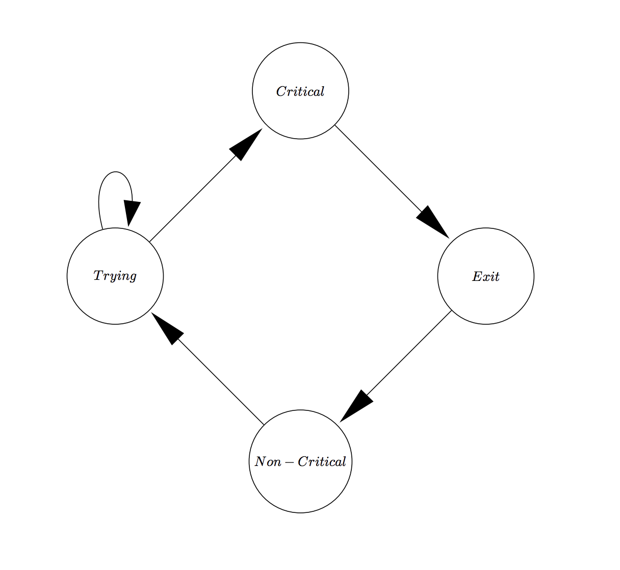 프로세스의 실행 단계는 비임계 구역, 시도, 임계 구역, 종료의 네 가지 상태로 나눌 수 있다. 프로그램 실행은 다음 순서로 이 네 가지 상태를 순환한다.[5]