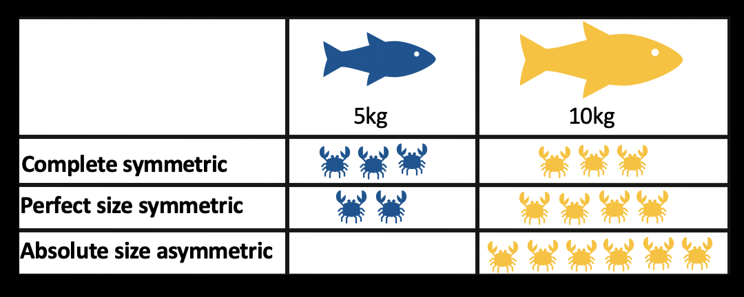 - 절대 크기 비대칭 - 가장 큰 개체가 사용 가능한 모든 자원을 착취한다.[36]