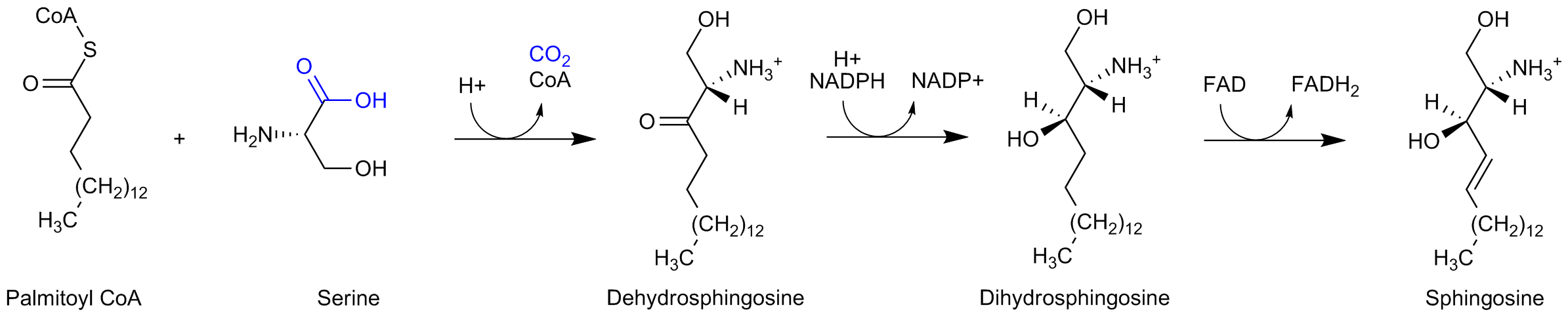 이미지에 나타난 바와 같이, 스핑고신 합성 과정에서 팔미토일 CoA와 세린은 축합 반응을 거쳐 3-데히드로스핑가닌을 형성한다.[10] 이 생성물은 환원되어 디하이드로스핑고신을 형성하고, 이는 FAD에 의한 산화 반응을 통해 스핑고신으로 전환된다.[10]