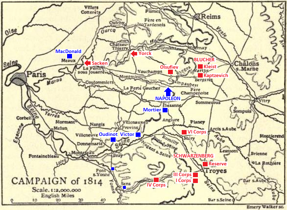 1월 말, 자크 마크도날 원수의 10,000~11,000명의 프랑스 군단이 북쪽에서 접근했다. 블뤼허는 마크도날 군단을 파괴하는 데 집중, 루드비히 요르크 폰 바르텐부르크 군단에 마크도날을 추격하게 하고, 파비안 고틀리브 폰 오스텐자켄 군단을 몽미라유와 라 페르테 수 조와르를 통과하는 도로로 보냈다. 표트르 미하일로비치 캅체비치와 프리드리히 그라프 클라이스트 폰 롤렌도르프의 군단이 도착하기를 기다리며, 자하르 드미트리에비치 올수피예프의 소규모 군단으로 군대를 연결했다.