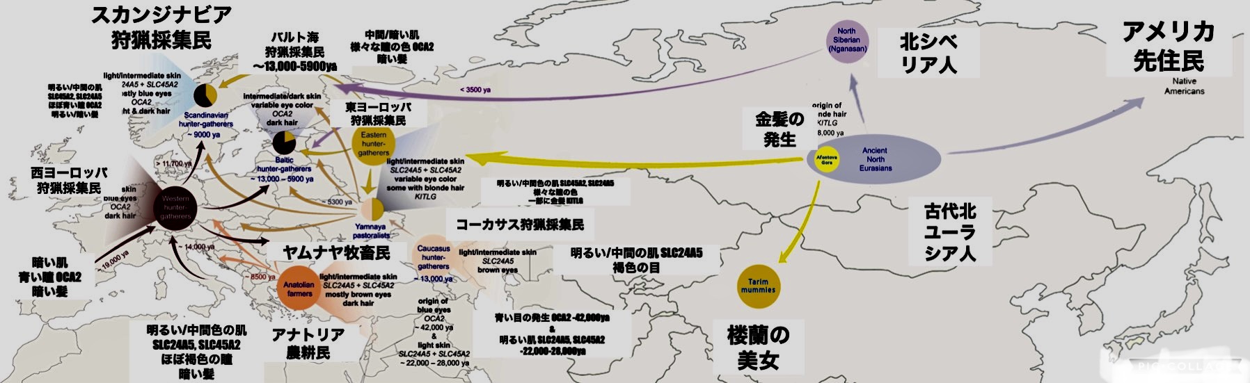 데이비드 라이히에 따르면, DNA 분석 결과 서유럽 수렵 채집민은 전형적으로 어두운 피부, 검은 머리, 파란 눈을 가졌던 것으로 나타났다.[63] 어두운 피부는 아프리카 기원에서 비롯되었으며, 파란 눈은 홍채의 색소 침착을 유발하는 OCA2 유전자의 변이로 인한 결과였다.[63]