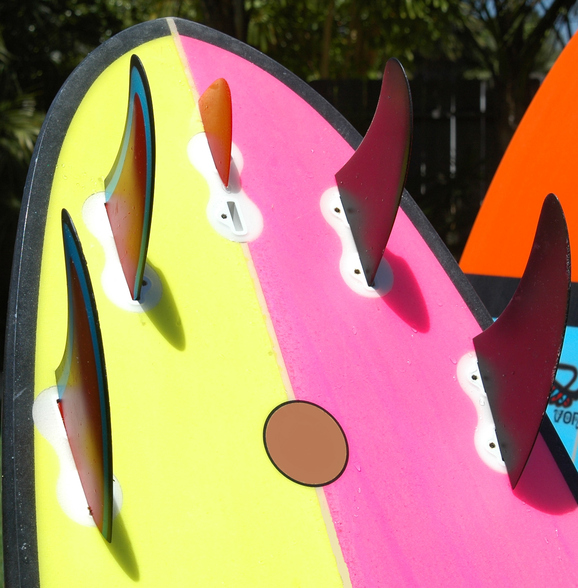 트라이 핀 디자인은 롱보드 활주력과 숏보드 성능을 통합하려는 시도이다.[41] 추가 핀은 수직 제어면이 검은 물에 있어 더 나은 턴 능력을 보장한다. 스러스터에서 대칭 포일 중앙 핀은 비대칭 캠버 트윈 핀 양쪽에 위치한다. 캠버는 앞, 위로 기울어져 파도 에너지를 보드 위로 올려 펴주며, 이는 로켓 노즐의 힘 벡터링과 유사하다.