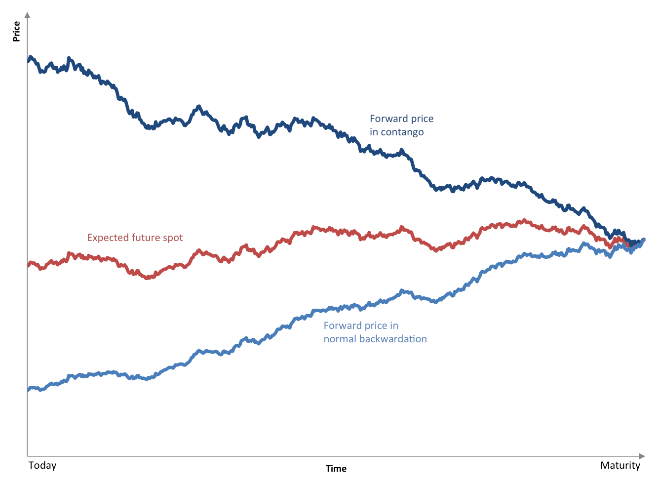존 메이너드 케인스와 존 힉스는 상품의 헤저(위험 회피자)는 미래에 상품을 팔려는 사람들이라고 주장했다.[4][5] 헤저는 선물 시장에서 순매도 포지션을 보유하고, 반대편의 투기자들은 순매수 포지션을 보유한다. 헤저는 위험 감소를 위해 선물 계약에서 손실을 감수하고, 투기자는 이익을 위해 계약을 체결한다. 따라서 투기자가 순매수 포지션을 보유하면 예상 미래 현물 가격이 선물 가격보다 커야 한다.만기 시 투기자의 예상 수익은 다음과 같다.