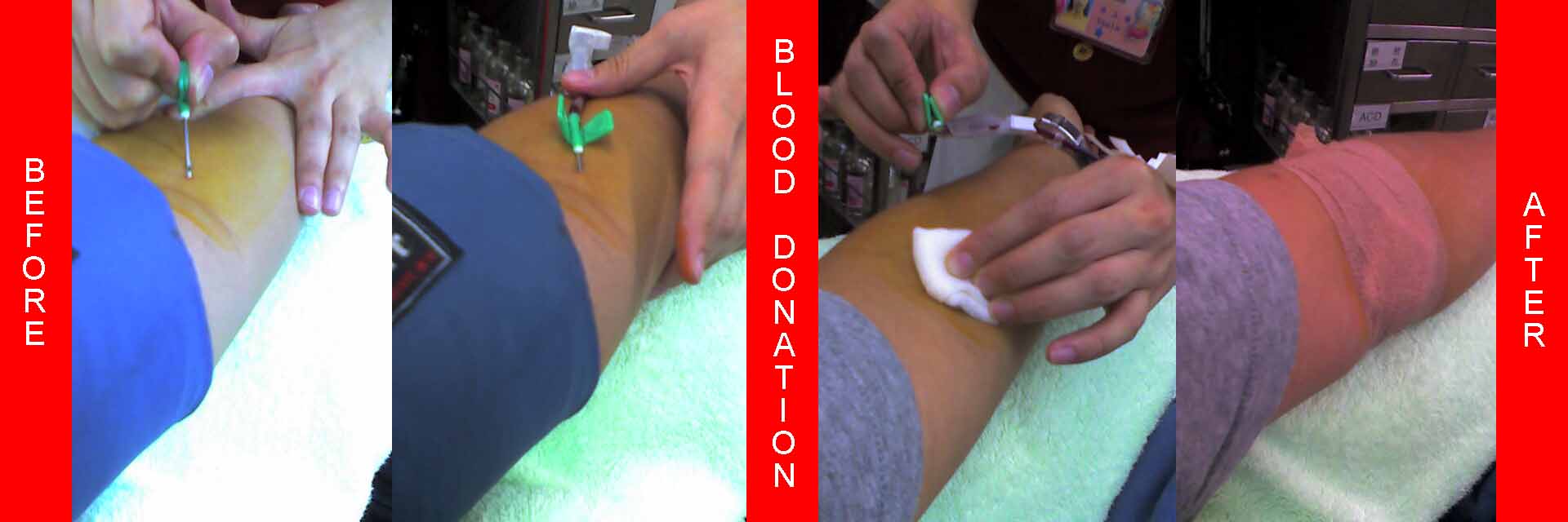 헌혈 과정의 다양한 단계에서 헌혈자의 팔. 왼쪽 두 사진은 지혈대로 사용되는 혈압계를 보여준다.