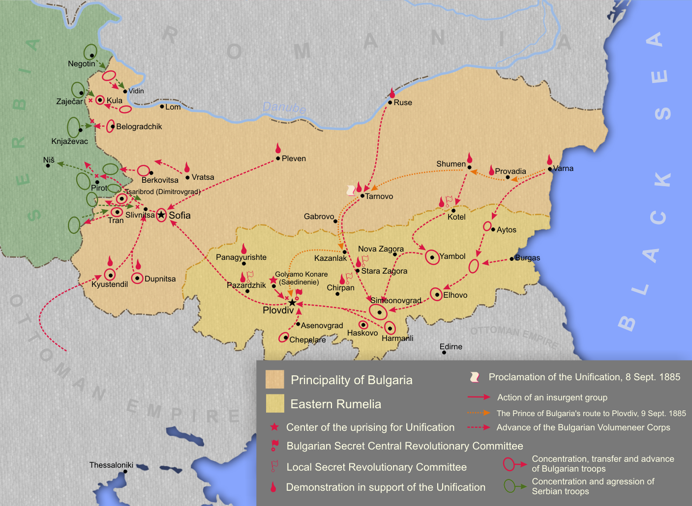 1885년 9월 6일(율리우스력 9월 18일), 불가리아와 오스만 제국의 자치령이었던 동루멜리아는 플로브디브에서 통일을 선포했다.[4] 베를린 조약에 의해 인위적으로 만들어진 동루멜리아는 주민 대다수가 불가리아계였다. 이 통일은 러시아를 포함한 열강들의 의지와는 반대되는 것이었다. 오스트리아-헝가리는 발칸 반도에서 영향력을 확장하고 있었으며, 특히 통일에 반대했다. 불가리아의 서쪽 이웃인 세르비아 또한 발칸 반도 내 자신의 입지가 약화될 것을 우려했다. 게다가 세르비아의 통치자 밀란 1세(1868~1889)는 세르비아 군대에 의해 진압된 티목 반란을 선동했던 니콜라 파시치와 같은 친러시아 반대파 지도자들이 불가리아로 망명한 것에 격분했다.