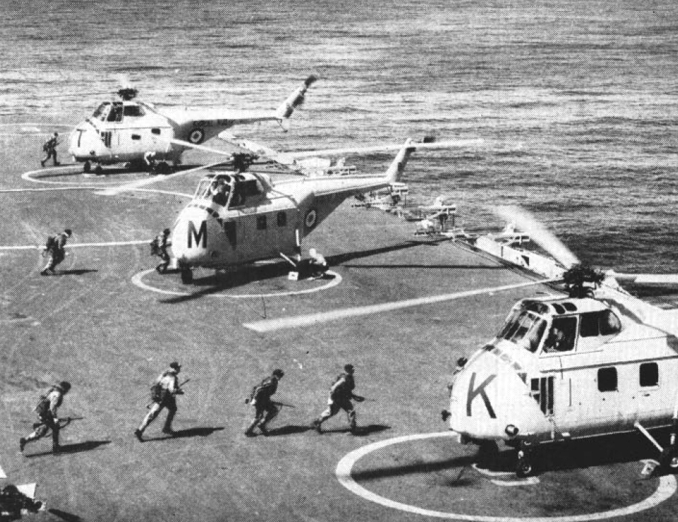 영국 해병대는 헬리콥터의 전술적 가치에 일찍부터 주목하여, 제2차 중동 전쟁 당시에는 병원 수송함으로 전용되었던 오션, 시시우스를 이용한 헬리본 전술을 전개했다. 그 실적을 바탕으로 1959년부터 1962년에 걸쳐 센타우르급 항공모함 중 알비온, 불워크가 코만도 모함(commando carrier영어)으로 개조되었다. 이는 수륙 양용 작전을 위한 헬기 항공모함이며, 미국 해군의 헬리콥터 상륙함(LPH)에 상당하는 것이었다.두 함의 개수는 필요한 최소한의 것으로, 함의 외관은 거의 변화하지 않았지만, 해병대 1개 코만도(약 600명)와 장비, 차량 50대의 탑재에 대응하고 있었다. 해병대원의 승함 인원은 불워크에서는 733명, 알비온에서는 900명이었다. 그 수송을 위해 호와일윈드 수송 헬리콥터 21기가 탑재되었다. 1971년에는 허미즈도 유사한 개수를 받았다. 다만 센토의 개수는 예산상의 이유로 중지되었다.