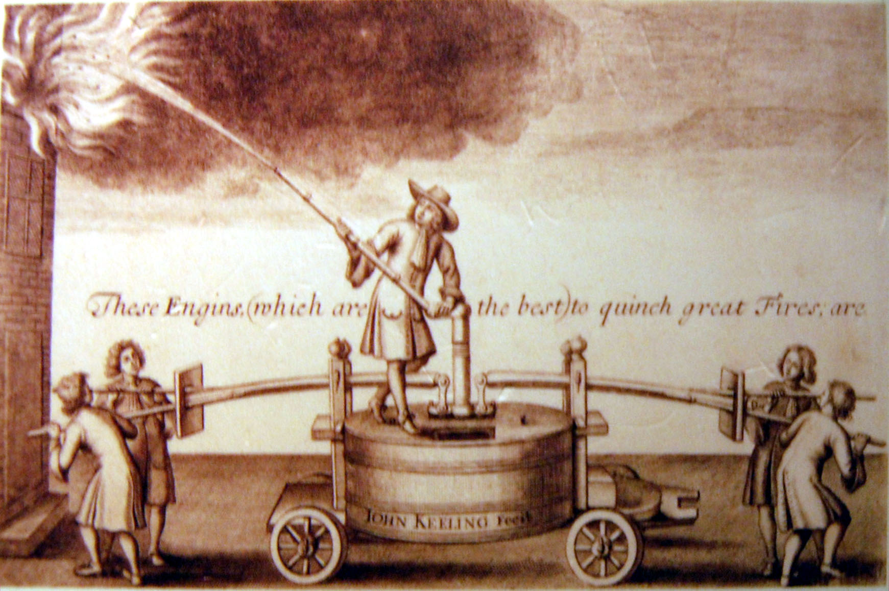 미국의 식민지 법률은 야간 화재에 대비하여 각 집에 현관에 물통을 두도록 요구했다. 필라델피아는 보스턴의 1654년 모델이 조셉 젠크스 시니어(Joseph Jenckes Sr.)에 의해 제작되어 등장한 지 여러 해가 지난 1719년에 손 펌프식 소방차를 얻었지만, 뉴욕의 두 대의 소방차가 런던에서 도착하기 전이었다.