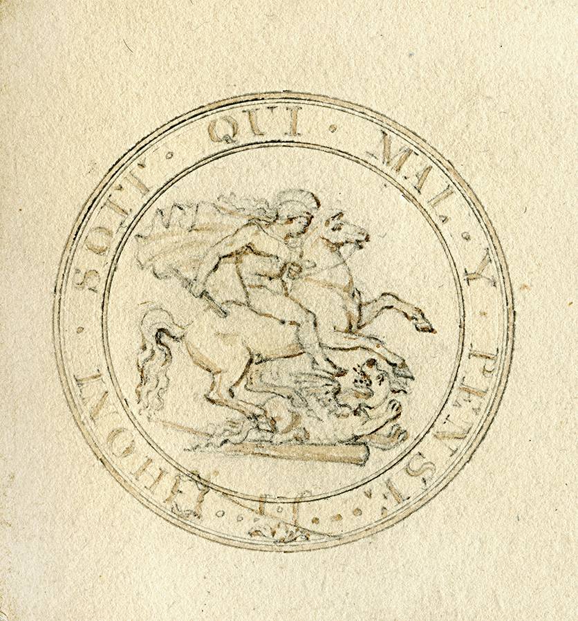 1817년 원본 디자인에서 성 게오르기우스는 부러진 창을 들고 있었으나, 1821년 디자인을 둘러싼 가터가 제거되면서 칼로 변경되었다. 1821년에는 헬멧 뒤의 머리카락 뭉치도 제거되었다가 1887년에 복원되었고, 이후 여러 차례 수정되었다.[2]