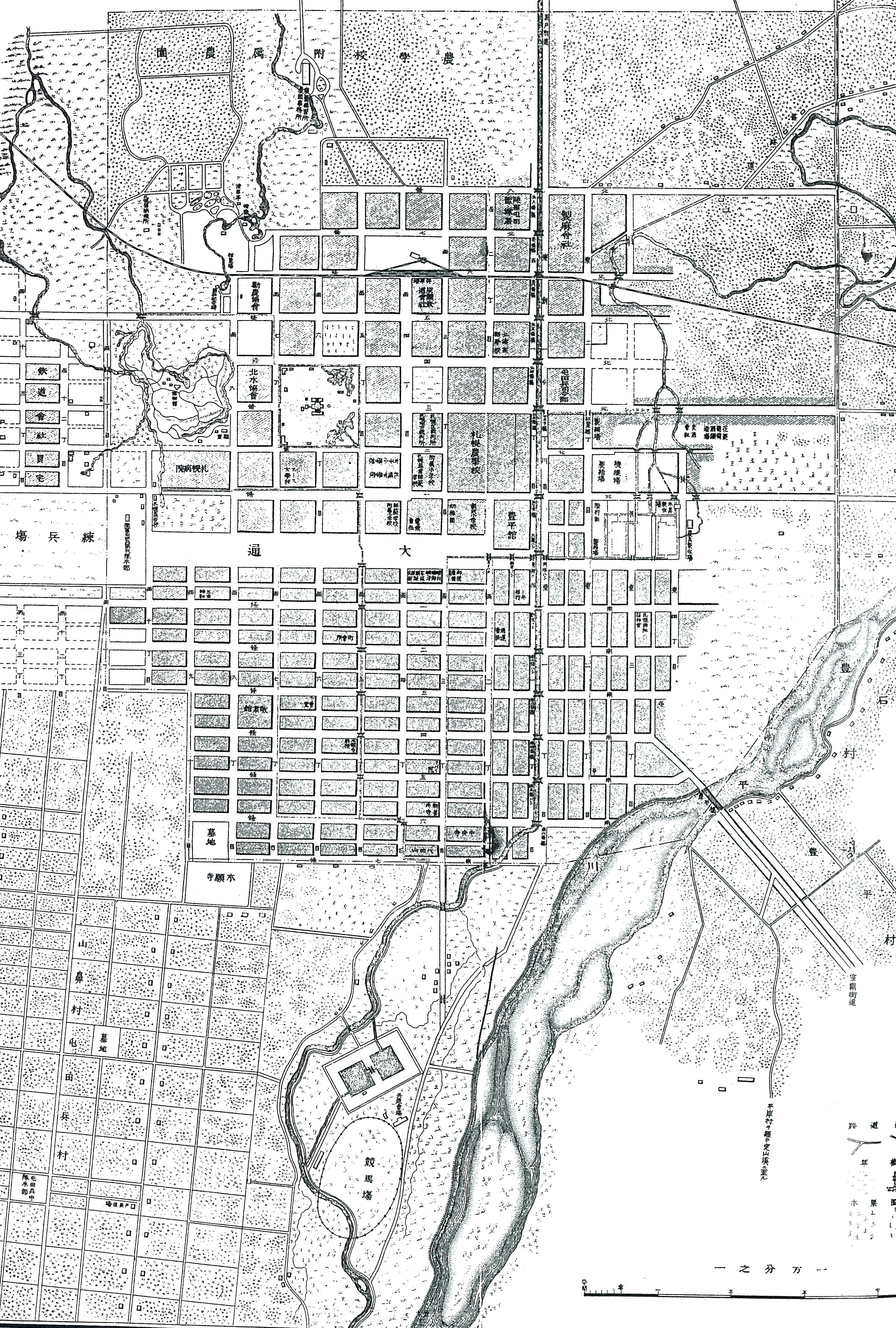 1866년(게이오 2년) 에도 막부의 관리 오토모 가메타로가 삿포로 촌을 개척할 때 농업용수와 배수를 위해 만든 것이 오토모 해자이다.[2] 삿포로 개척 당시, 현재의 미나미4조니시2초메 부근에서 이부리강(도요히라강 지류)에서 물을 끌어와 기타6조(현재 JR 삿포로역 부근)에서 동쪽으로 방향을 틀어 오토모 관사 뒤(현재 기타13조히가시16초메, 삿포로 촌 향토 기념관 동쪽에 있는 오토모 공원)에서 후시코가와로 연결되었다.[6] 개착 당시에는 "용수" 또는 "용악수"라고 불렸으며, 벼농사용 용수 외에도 습지부의 악수(관개나 음료에 적합하지 않은 물)를 처리하기 위한 목적이었다.[6]3. 2. 개척사 시대 (1869년 ~ 1880년)