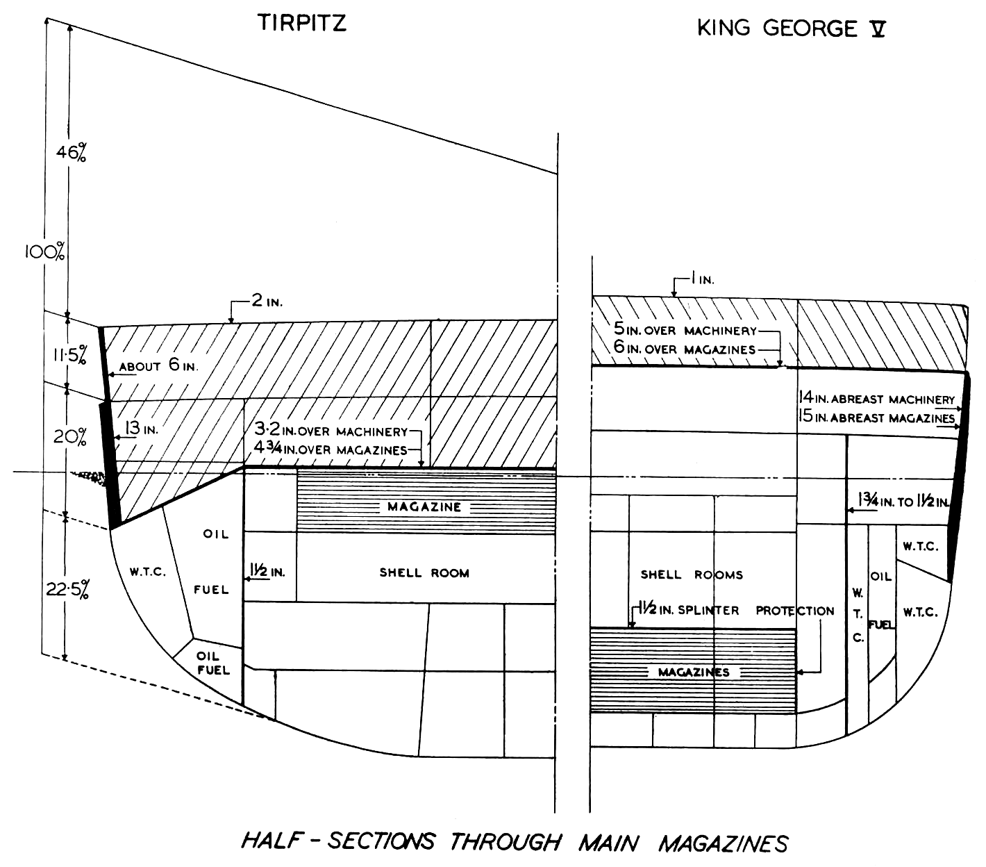 어뢰 방수 격벽은 벨트 장갑과 함께 어뢰 공격에 대한 다층 방어 체계를 구축한다.[1] 어뢰 방수 격벽은 어뢰 폭발의 충격을 흡수하고, 선체 내부로의 침수를 막아 군함의 부력을 유지하는 역할을 한다. 주 갑판의 장갑판은 주 갑판 뒤 몇 미터 떨어진 곳에 배치된 어뢰 방수 격벽으로 보완되어 주 갑판이 관통되더라도 선박의 방수성을 유지하도록 설계되었다.[1] 일부 설계에서는 주 갑판 주변의 외부 공간에 연료유, 해수 또는 담수를 채운 저장 탱크를 배치하여 탄두와 포탄의 폭발력을 흡수 또는 분산시켰다.[1] 다른 설계에서는 외부 공간을 비워 초기 폭풍파의 일부가 소멸되도록 하고, 내부 액체 층이 파편을 흡수하고 충격파를 더 넓은 지역으로 확산시켰으며, 장갑 ''보유 격벽''은 액체가 선박의 다른 부분으로 들어가는 것을 막았다.[1] 이러한 다층 설계는 티르피츠와 킹 조지 5세급 전함에 적용되었다.[1]