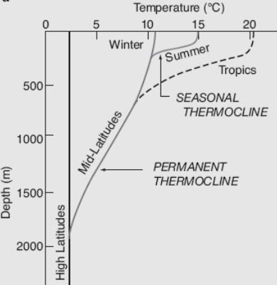 햇빛은 대부분 바다 표면의 몇 cm에서 흡수되며, 낮에는 바다가 햇빛을 받아 따뜻해지고 밤에는 열을 우주로 방출하며 식는다. 파도는 바다 표면 근처의 물을 섞이게 하고, 해류로 인한 난류는 열을 더 깊은 곳으로 분산시켜 수심 100m 정도까지는 수온이 비교적 균일하게 유지되도록 한다. 이 층을 혼합층이라고 부른다. 혼합층 아래에서는 낮과 밤의 변화에도 수온이 비교적 안정적으로 유지된다. 심해의 수온은 깊이에 따라 점차 낮아진다. 바닷물은 -2.3°C가 되어야 얼기 시작한다.수온약층의 깊이는 장소에 따라 다르다. 열대 지방에서는 연중 거의 변화가 없는 수온약층이 나타나지만, 온대 지방에서는 계절에 따라 수온약층의 깊이가 변한다. 극지방에서는 바닷물이 표면에서 바닥까지 차갑기 때문에 수온약층이 얕거나 아예 나타나지 않는다. 해빙은 단열재 역할을 한다.[3]