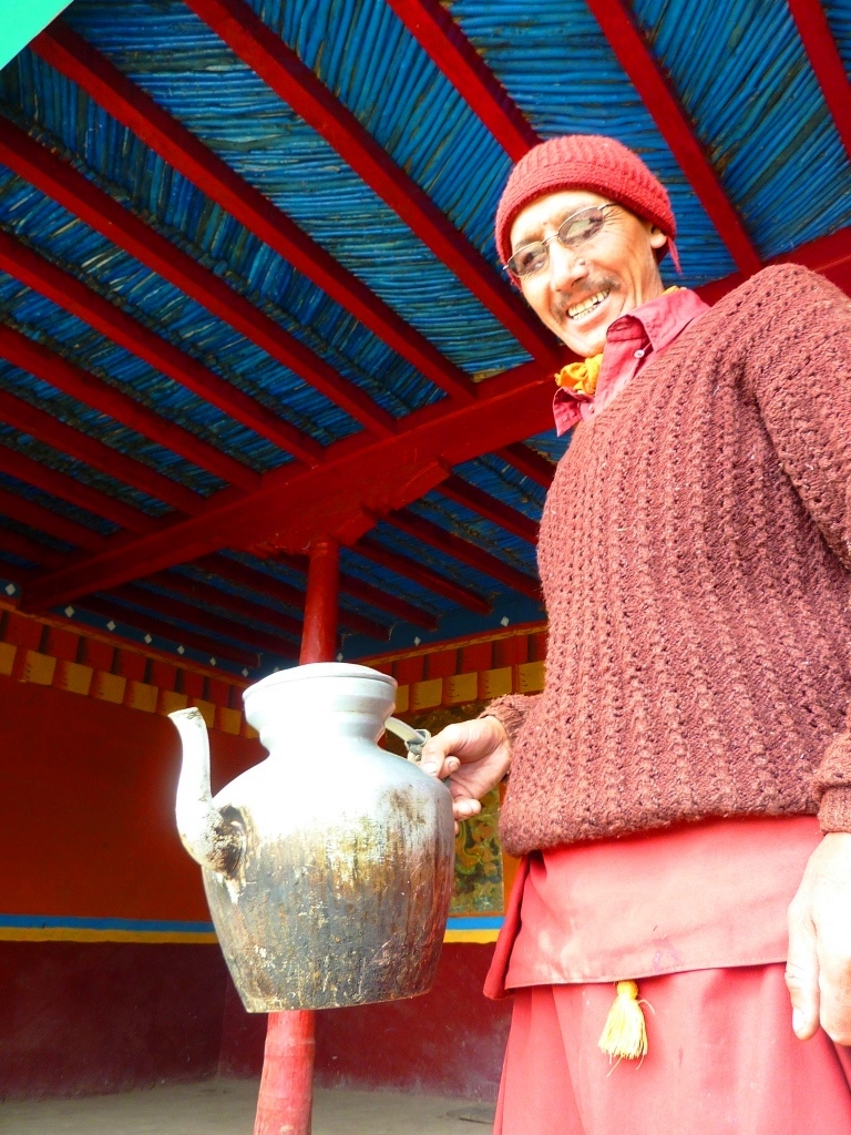티베트 라싸에 있는 간덴 사원에서는 전통 방식에 따라 매일 밤 승려들을 위해 버터 차를 준비한다. 큰 솥에 여러 개의 차 벽돌을 넣고 끓이며, 수백 킬로그램에 달하는 버터를 사용하기도 한다. 차를 만드는 각 단계마다 고유한 기도를 함께 진행한다. 차가 완성되면 한 승려가 징을 쳐서 다른 승려들에게 차가 준비되었음을 알린다.