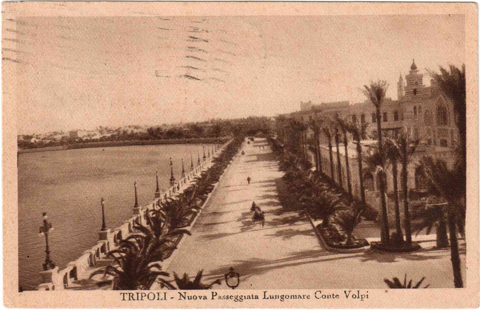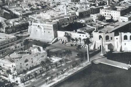 이 광장은 원래 이탈리아 식민지 통치자들이 옛 빵 시장 (''수크 알-쿠브스'') 자리에 건설했으며, 1930년대에 여러 차례 확장되었다.이탈리아의 식민 통치자가 세웠던 그린 광장은 한 쪽에는 붉은 성이 세워져 있고, 한 쪽에는 해안가로 향하는 큰 길이 나 있다. 길 주변에 세워진 큰 두 기둥들 중 한 쪽 기둥 위에는 나무배의 철 형상이 있고, 다른 한 쪽 위에는 승마인의 형상이 있다.