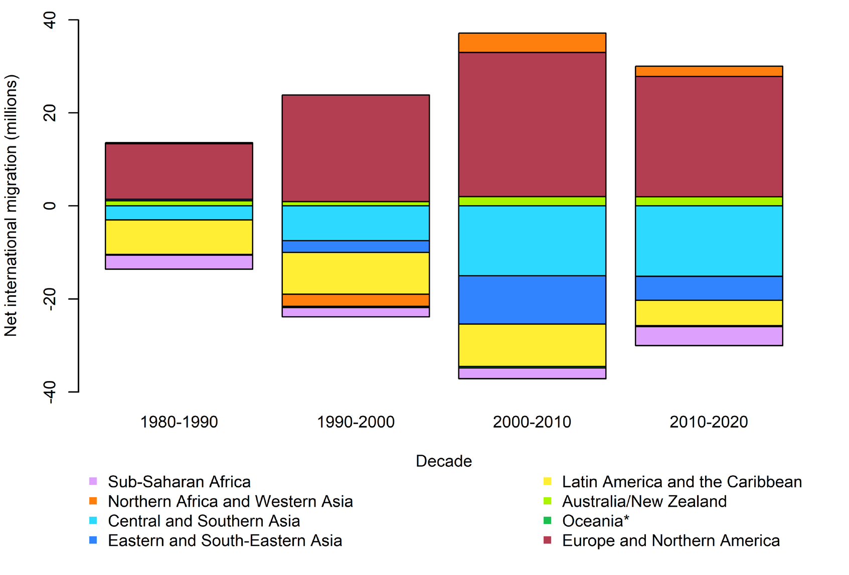 2010~2020년 동안 유럽, 북아메리카, 중동, 북아프리카, 호주, 뉴질랜드 지역은 순유입(입국 이민>출국 이주)이 나타났고, 중앙아시아, 남아시아, 라틴 아메리카, 카리브해, 동아시아, 동남아시아, 사하라 이남 아프리카, 호주 및 뉴질랜드를 제외한 오세아니아 지역은 순유출(입국 이민<출국 이주)이 나타났다.[11][12]