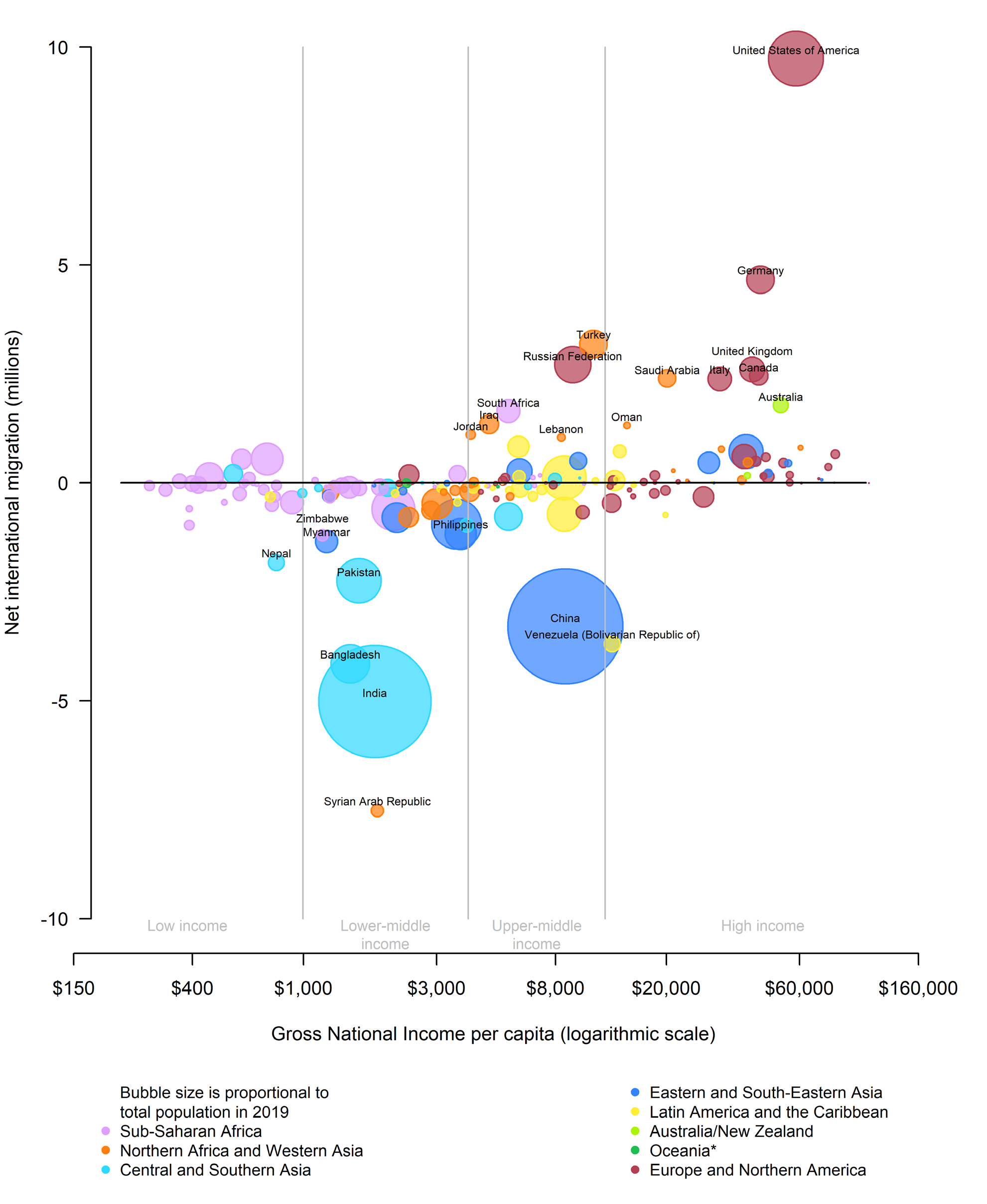 같은 기간 100만 명 이상의 순유출을 겪은 국가는 방글라데시, 네팔, 필리핀 등 외국인 노동자 송출이 많은 국가와 시리아, 베네수엘라, 미얀마 등 내전, 경제 위기, 불안, 분쟁 등을 겪은 국가들이었다.
