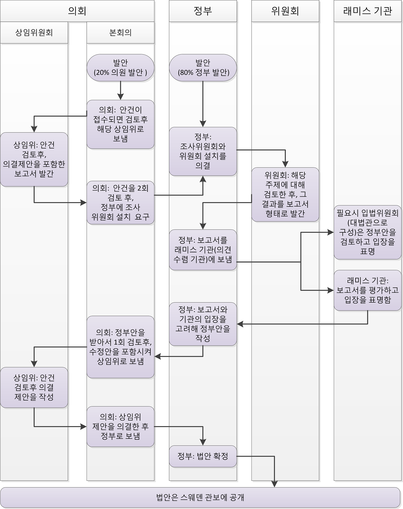 정부 법안은 제출 전 조사위원회를 구성해 관련 전문가에게 조사하도록 하고, 이때 정부는 방향을 제시할 수 있다. 조사위원회의 검토 후 타당하다는 결론이 나오면 의견수렴기관(래미스 기관)에 보고서를 보내 검토 및 의견 제시를 요구한다. 필요한 경우 입법위원회(대법관으로 구성, 합헌성 사전 심의)에 보내 법률의 합헌성을 검토한다. 의견 수렴 후 정부는 최종 법률안을 작성해 의회에 제출한다.