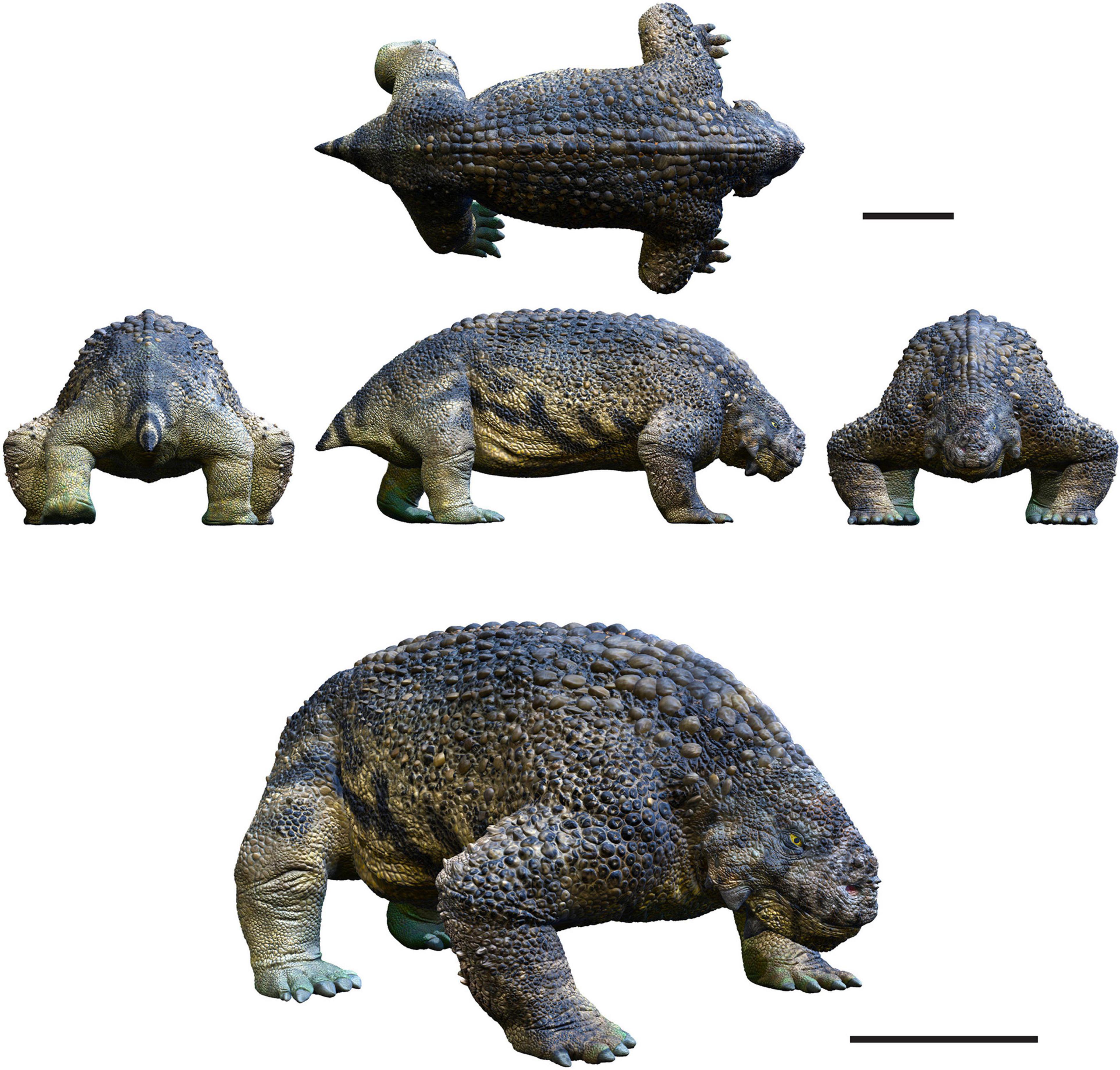 스쿠토사우루스는 뼈로 된 갑옷과 두개골을 장식하는 여러 개의 뾰족한 뿔을 가진 거대한 체구의 파충류였다.[45] 비교적 작은 몸집에도 불구하고 무겁고 짧은 다리로 인해 오랜 시간 동안 빠른 속도로 움직일 수 없어 큰 포식자의 공격에 취약했다. 스스로를 방어하기 위해 스쿠토사우루스는 특히 목 부위에 강력한 근육으로 덮인 두꺼운 골격을 가지고 있었다. 피부 아래에는 골판이 줄지어 있었고, 이 판은 마치 두정갑 갑옷의 한 형태였다.[52]