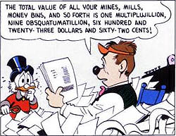 스크루지의 재산 총액은 작품마다 다르게 묘사되어 정확하게 알 수 없다.[21] 칼 바크스의 ''두 번째 부자 오리''에서는 ''타임'' 기사를 인용하여 "1 곱하기-플루질리언, 9 옵스쿼튜마틸리언, 623달러 62센트"라고 묘사했다.[22] 돈 로사의 ''스크루지 맥덕의 삶과 시대''에서는 "5 곱하기-플루질리언, 9 임포시비딜리언, 7 판타스티카 조 달러 16센트"라고 언급한다. 1949년에 출판된 ''월트 디즈니의 크리스마스 퍼레이드'' 1호에 실린 "산타에게 보내는 편지"에서는 "11 옥틸리언 달러"를 언급하기도 한다. 오리 형제: 잃어버린 램프의 보물에서는 "쿼드질리어네어"라는 표현이 등장하며, ''오리 형제'' 리부트 첫 번째 에피소드에서는 스크루지가 "수조 달러 규모의 사업"을 운영한다고 언급한다.