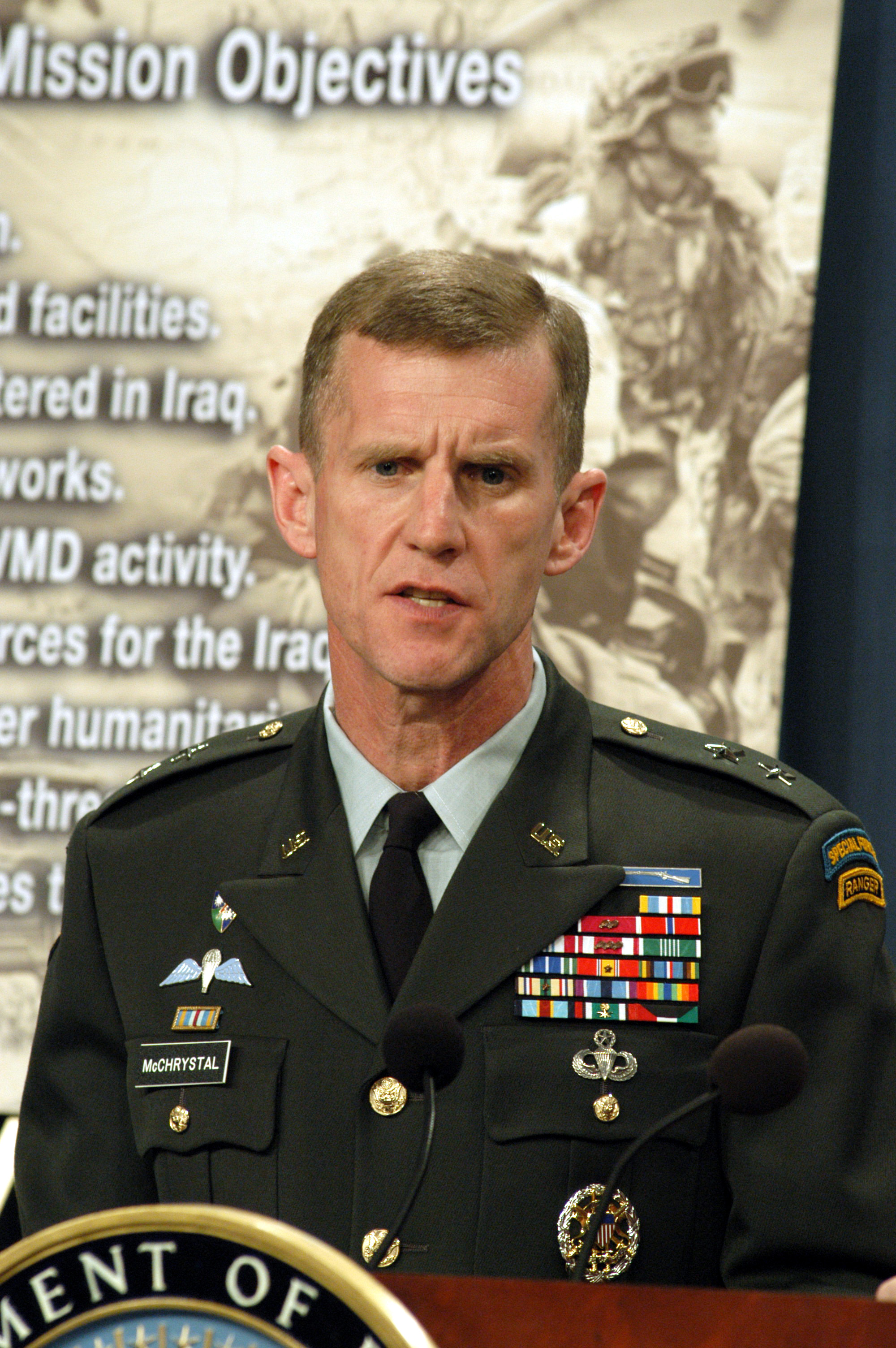 2003년 3월 이라크 전쟁이 시작될 때, 매크리스털은 2002년 7월부터 펜타곤에서 합동참모본부 작전 부국장(J-3)으로 근무하고 있었다.[20] 그는 이라크에서의 미군 작전에 대한 전국 텔레비전 펜타곤 브리핑을 맡았으며, 2003년 4월 바그다드 함락 직후 "주요 전투는 끝났다고 예상합니다"라고 발표하기도 했다.[24][25]