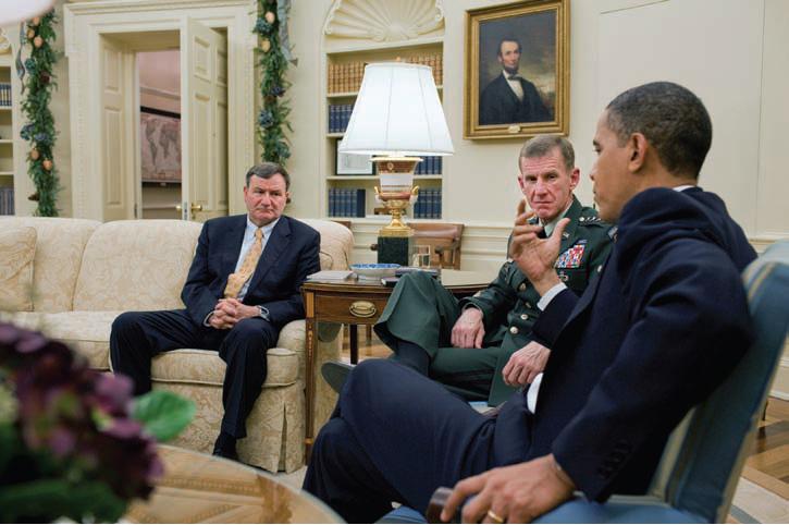 2010년 6월 23일, 오바마 대통령은 롤링 스톤 잡지 기사[105]에서 바이든 부통령 및 다른 정부 고위 관계자들을 비판한 매크리스털을 아프간 주둔군 사령관에서 해임했다.[106][107][108] 매크리스털은 워싱턴 D.C.로 소환되었고, 오바마 대통령은 그의 사표를 수리했다.[106][107][108] 오바마 대통령은 매크리스털의 후임으로 데이비드 퍼트레이어스 중앙군 사령관을 지명했다.[108][109]