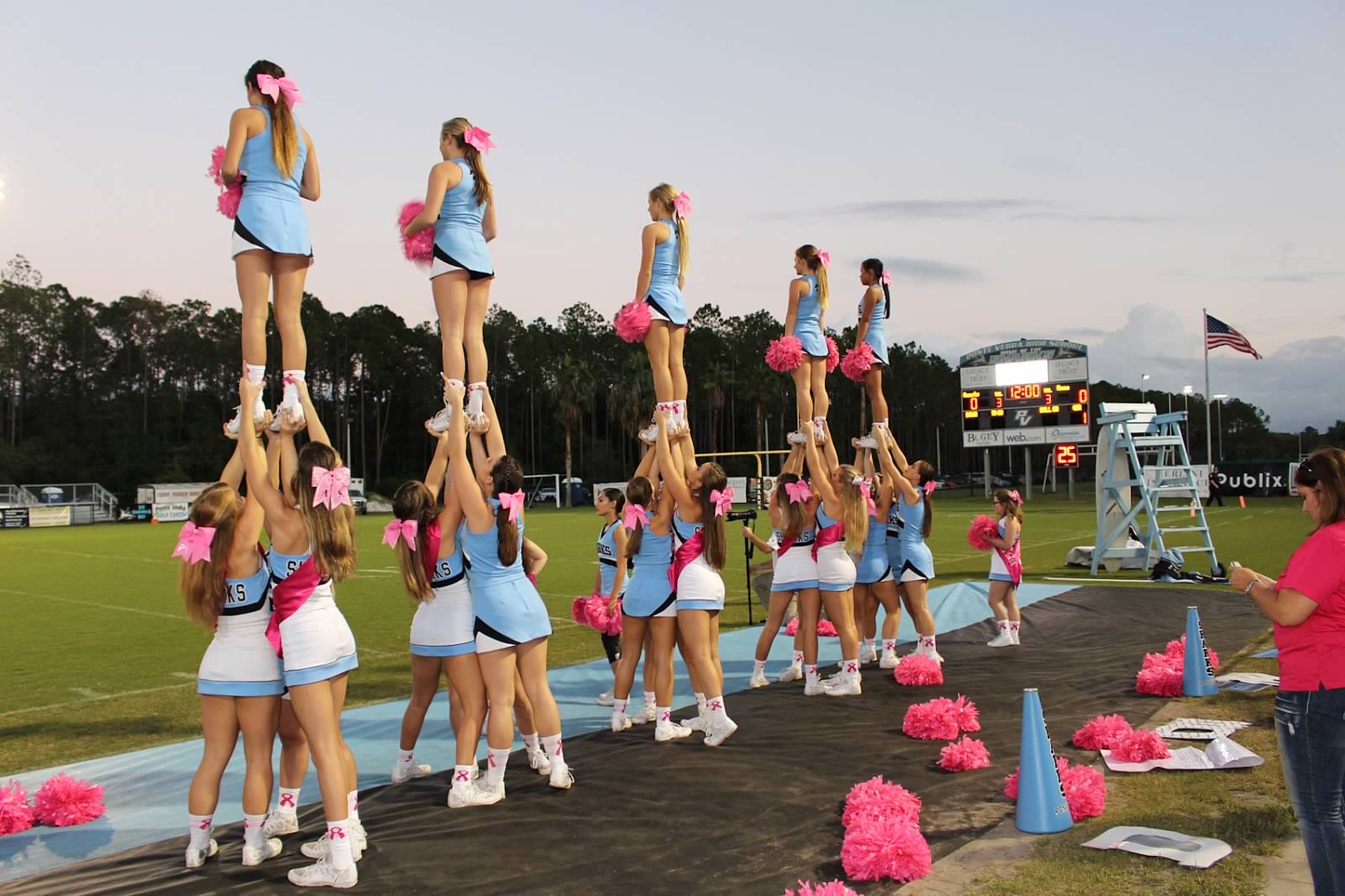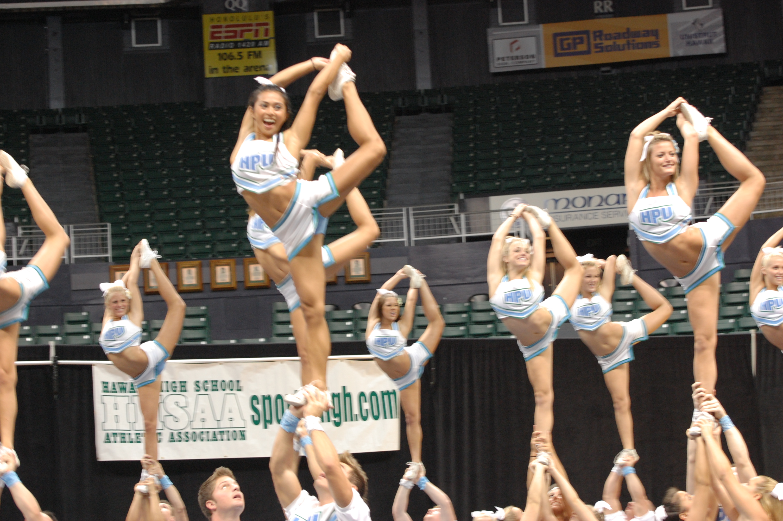 ''플라이어''(Flyer)가 맨 위에, ''베이스''(Bases)가 맨 아래에 위치한 ''익스텐션''(Extension) 스턴트. (폰테 베드라 고등학교)