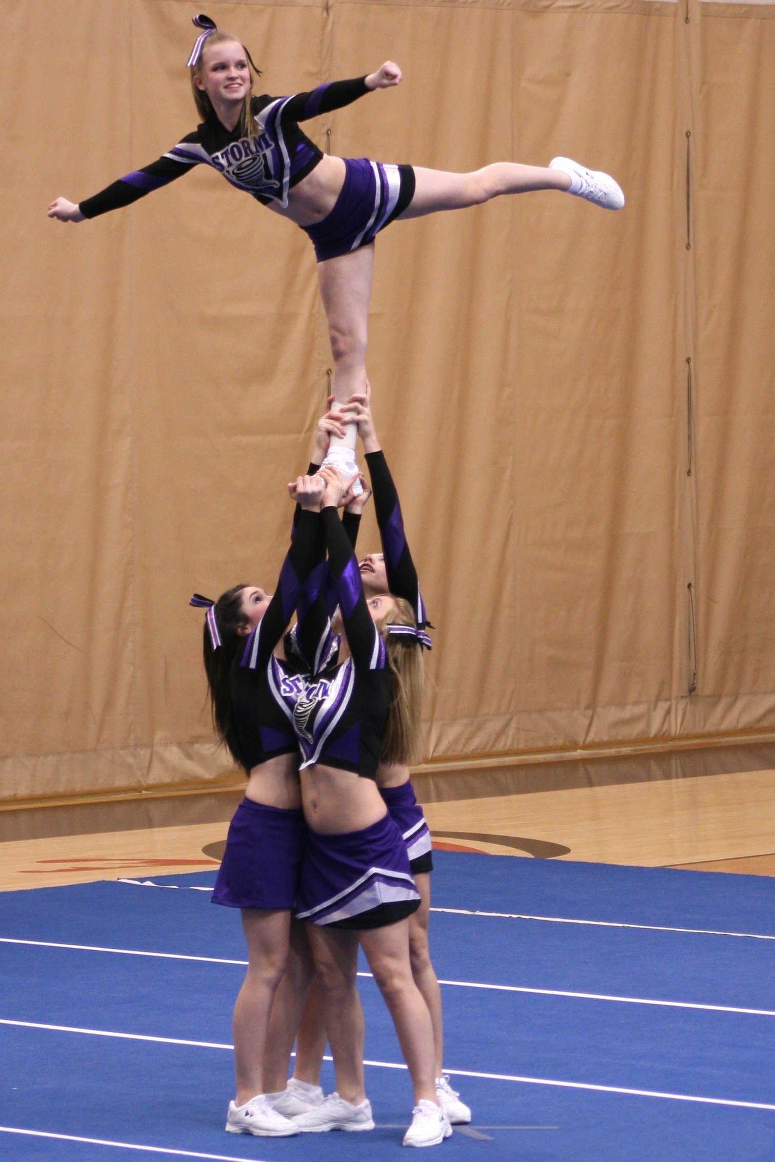 • '''Extension (익스텐션)''': 프렙과 유사하게 플라이어가 각 발을 베이스의 손에 두지만, 턱 높이가 아닌 베이스가 팔을 머리 위로 완전히 뻗어 지지하는 스턴트이다. 베이스는 어깨를 펴서 플라이어를 위한 견고한 플랫폼을 만들어야 하며, 플라이어는 베이스가 머리 위에서 쉽게 잡을 수 있도록 체중을 유지해야 한다.[4][5]