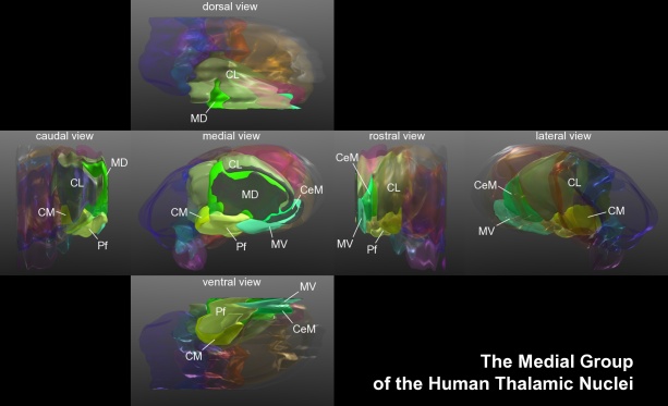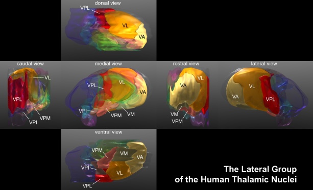 • 외측 복측핵 (VL): 소뇌핵으로부터 입력을 받아 주로 운동성 대뇌피질로 투사한다.