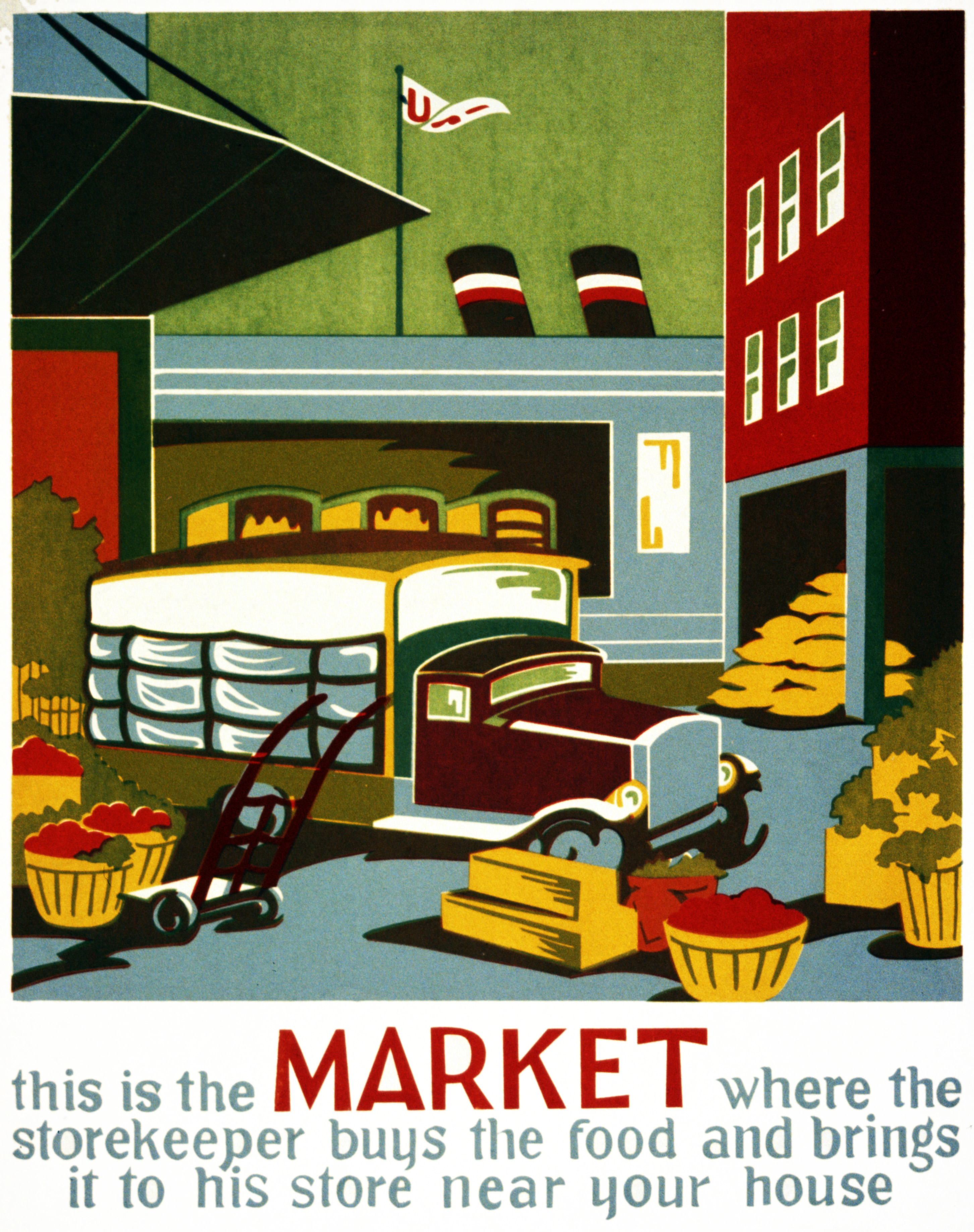 시장에서 판매자와 구매자는 재화의 종류, 가격, 대금의 지급 조건 등을 서로 약속하여 매매한다.[63] 시장은 수요와 공급이 만나 가격을 사용하여 경제 주체 (기업, 가계, 개인 등) 간에 정보를 전달하고, 이를 통해 생산과 분배를 조절하는 조정 메커니즘의 기능을 수행한다.[2]