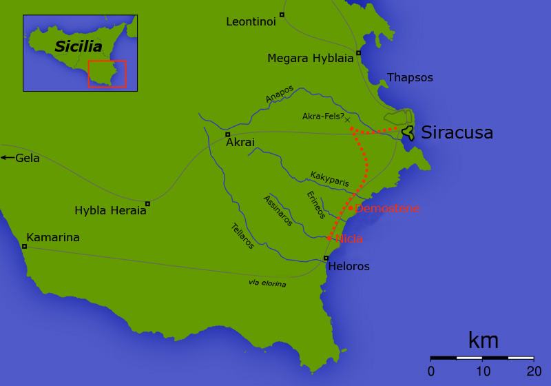 시라쿠사 초기 병력 | 호플리테스 5,000–6,000명 기병 1,200명 최소 삼단 노선 100척 |