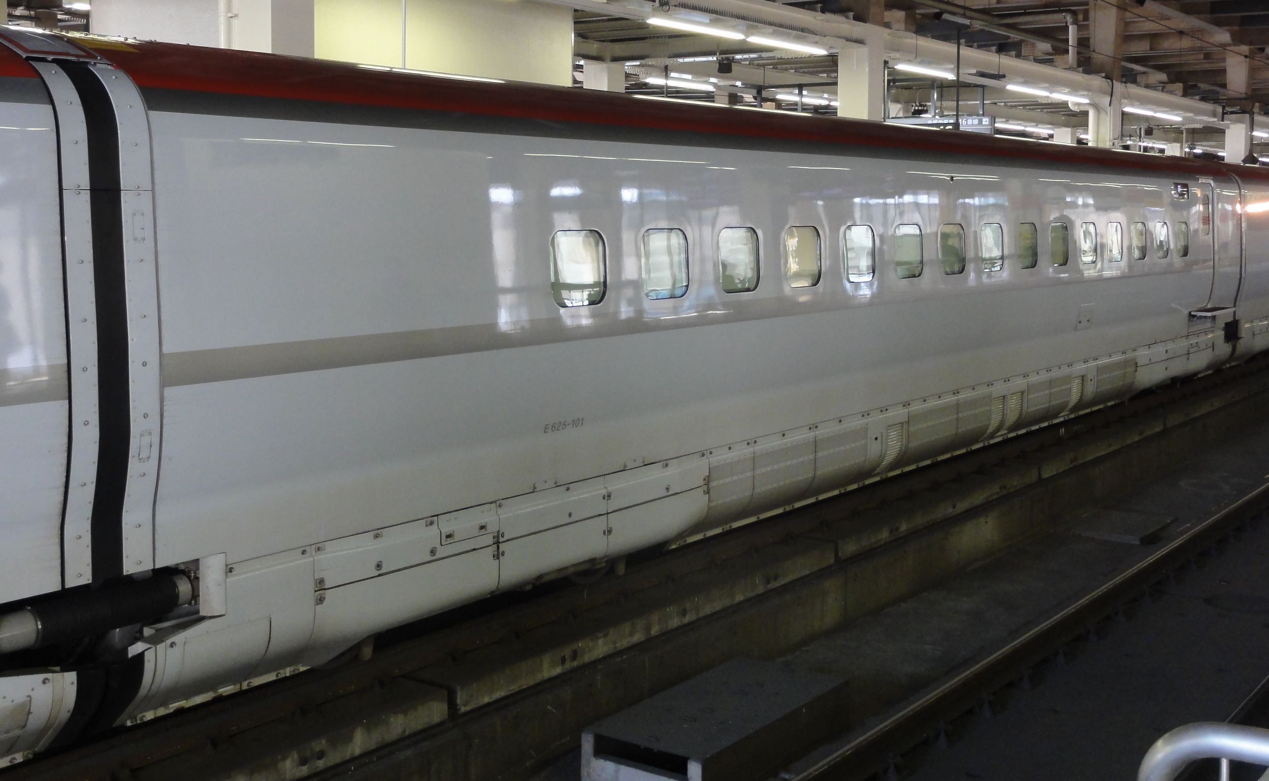신칸센 E955계 전동차에서 테스트된 '애로우 라인'을 바탕으로 선두 형상을 만들었다. 노즈 길이는 약 13m로 E955형 11호차와 같고, E3계의 약 6m보다 길다. 선두차량 노즈 길이 때문에 편성 정원이 줄어드는 것을 막기 위해 E3계의 6량 편성에서 7량 편성으로 늘렸다.차체 하부 기기는 차체 프레임 가로 빔에 매다는 방식으로, 소음 대책으로 점검 뚜껑을 겸한 커버와 대차 커버로 차체 아래 절반을 덮는 구조로 되어 있으며, 커버와 대차 커버에는 흡음재가 설치되어 있다.[71] 차체 사이에는 편성 전체의 흔들림을 억제하기 위한 차체간 댐퍼와 풍절음 저감, 롤링을 억제하기 위해 편측 지지방식에 의해 천장 부분과 측면 부분으로 분할되어, 링 기구로 연결 상대 차량에 밀어붙이는 구조의 전주 다이어프램을 장비하고 있다.[72]