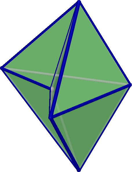 삼각쌍뿔은 6개의 정삼각형 면, 5개의 꼭짓점, 9개의 모서리를 가진 존슨 다면체이자 델타다면체로, 두 정사면체를 밑면끼리 결합한 형태이며, 분자 기하학, 색채 이론 등 다양한 분야에 응용된다.