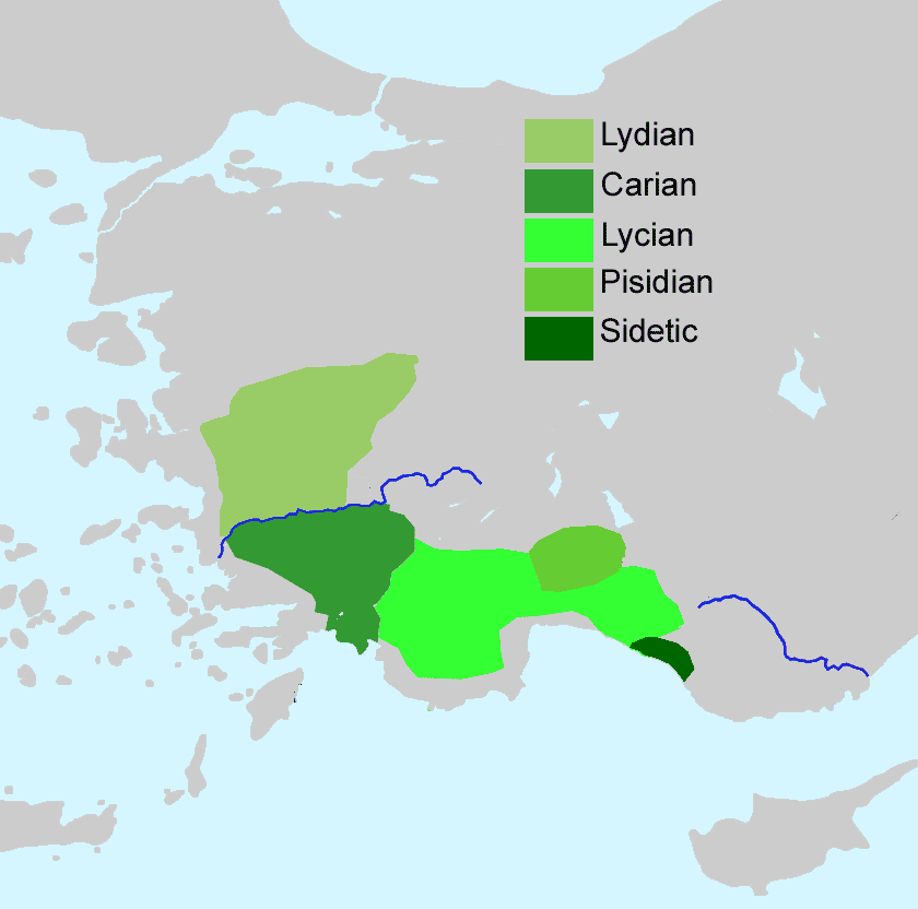 - 카리아어: 카리아 본토 외에도, 이집트·그리스에 비문이 남아 있다. 이집트에는 기원전 7세기 이후의 카리아인 용병의 낙서가 다수 남아 있다. 기원전 3세기경에 소멸되었다.