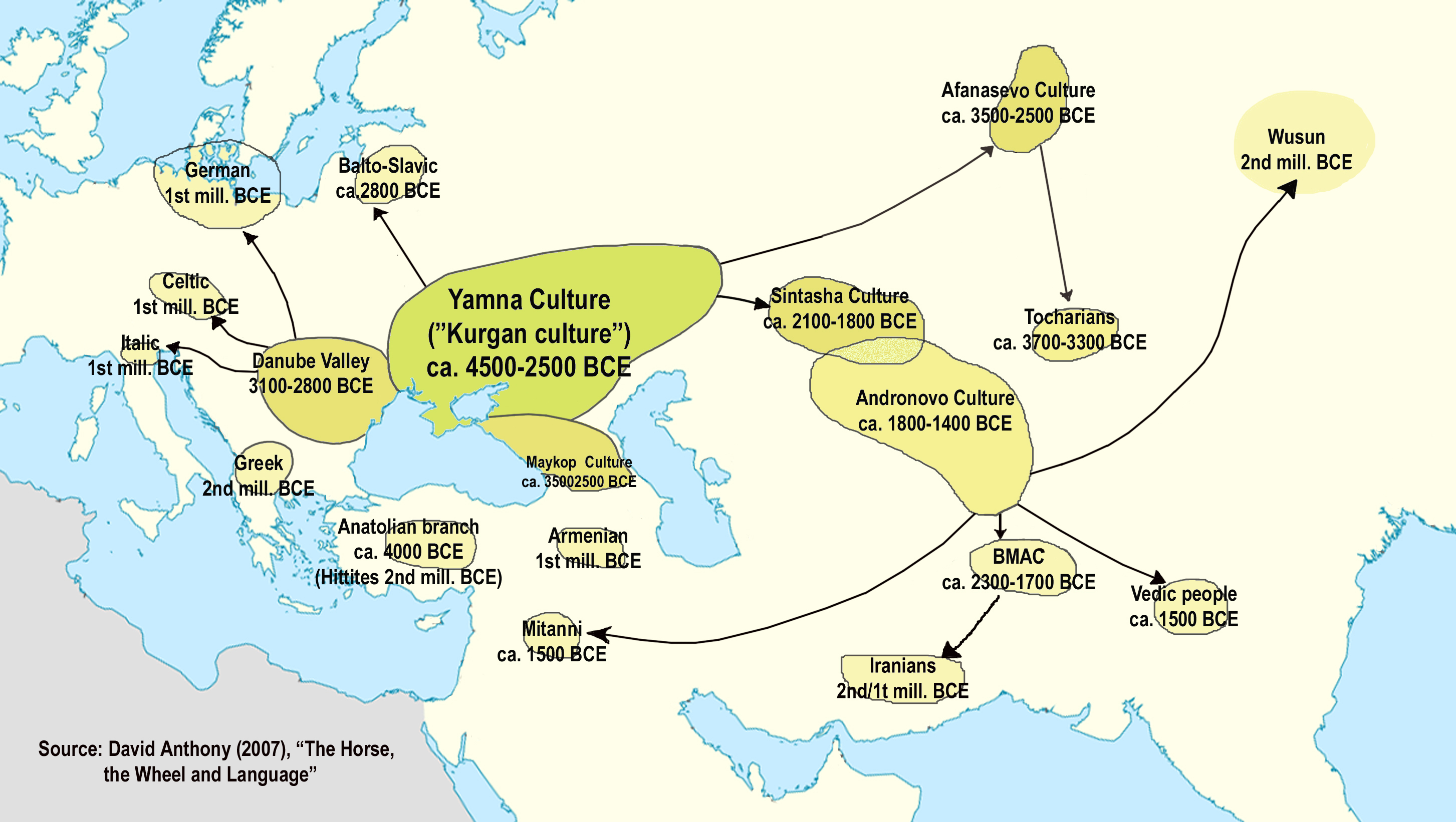 아나톨리아인들은 이미 도시, 문자를 사용하는 관료제, 왕국과 왕궁 숭배가 확립된 지역에 침입했다.[18] 이들은 지역 주민, 특히 해티인의 문화에 언어적, 정치적, 종교적으로 큰 영향을 받았다.[19] 크리스토퍼 벡위스는 아나톨리아인들이 해티인에게 고용되어 다른 인도유럽인 집단에 맞서 싸우면서 아나톨리아에서 처음 발판을 마련했다고 주장한다.[20]