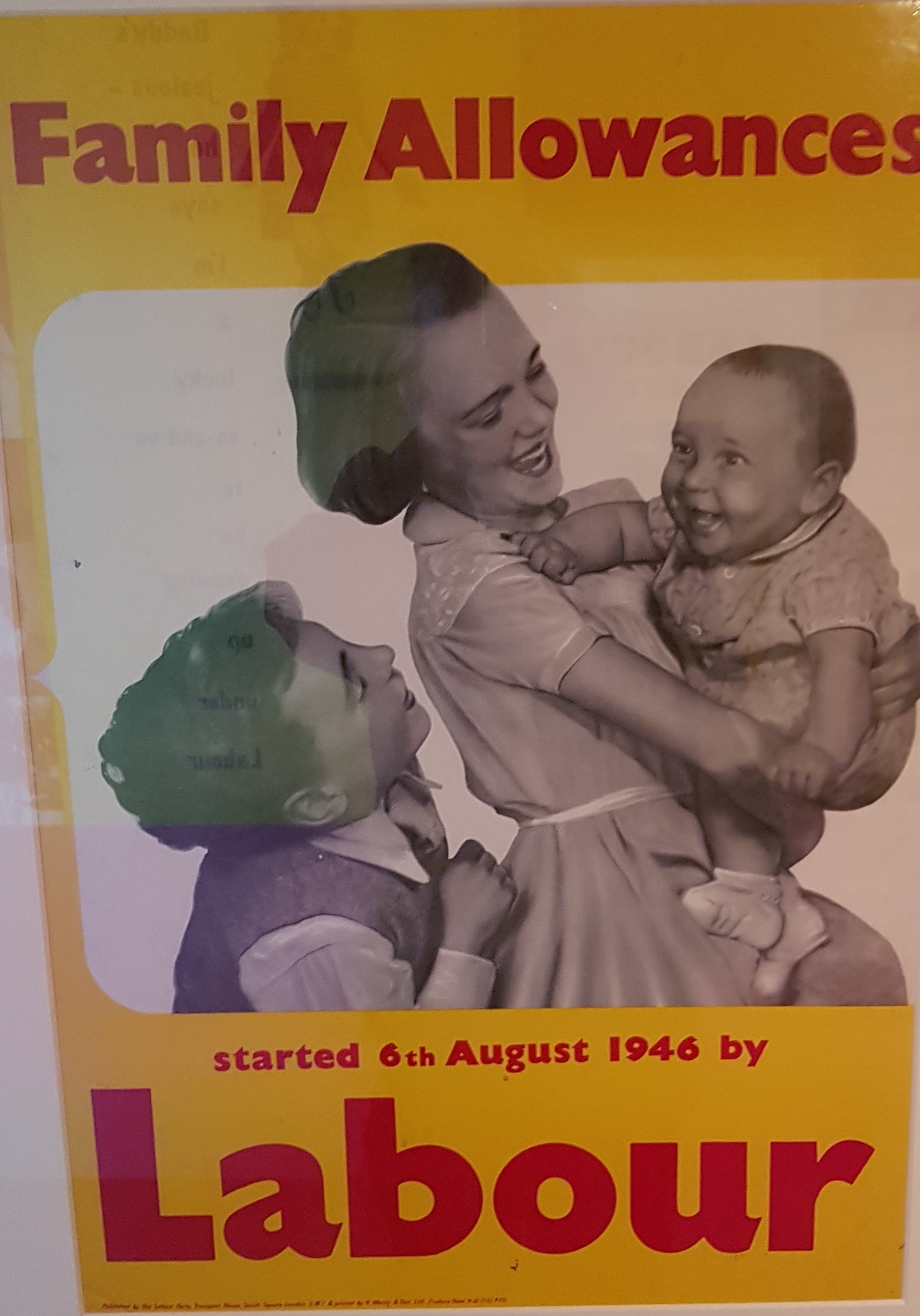 : 16세 미만 아동이 대상이며, 교육·직업 훈련 중인 경우 20세 미만까지 지급된다.[36] 소득이 5만파운드를 초과하는 사람이 아동 수당을 받는 경우, 아동 수당세로 실질적으로 지급액이 감소하며, 소득이 6만파운드를 초과하면 실질적인 지급액이 0이 된다.[37] 또한, 아동 수당과 별도로 아동세액공제 제도가 있으며, 현재 다른 세액 공제 및 지원 제도와 통합된 로 이전 중이다.
