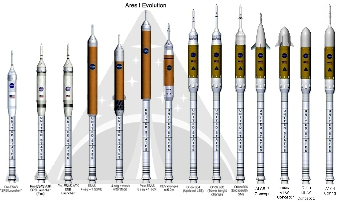 초기 아레스 I은 1단으로 기존의 4개 세그먼트를 결합한 고체 로켓 부스터(SRB)를 사용하고, 2단에는 우주 왕복선 주 엔진(SSME) 1기를 사용할 예정이었다.[83] 그러나 추가 시험 결과, 오리온 우주선이 4세그먼트 부스터로는 너무 무겁다는 것이 밝혀졌다.[9]