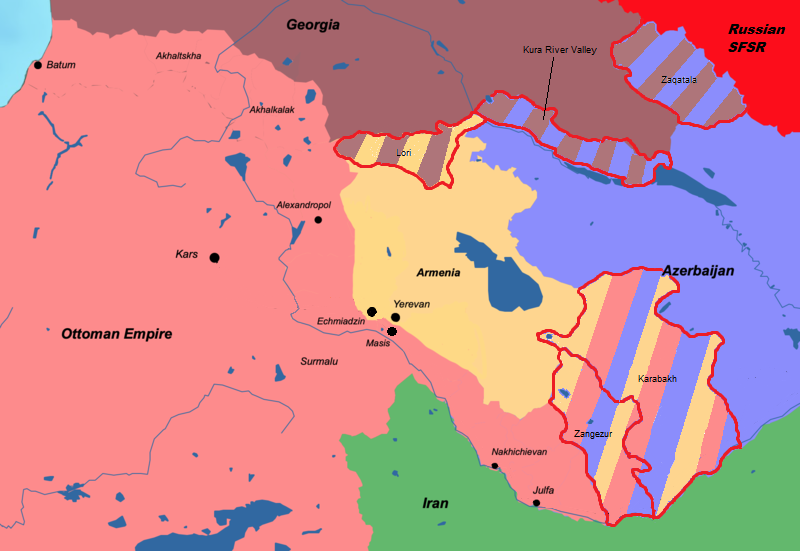 1919년 5월 ~ 6월 아르메니아 제1공화국 지도. 짙은 빨간색으로 표시된 부분은 미국 국무부가 1920년 11월에 그린 윌슨식 아르메니아의 서쪽 국경선이며, 이는 세브르 조약에 따라 아르메니아에 할당된 영토를 나타낸다. § 승인 참고.